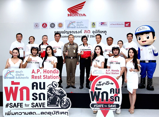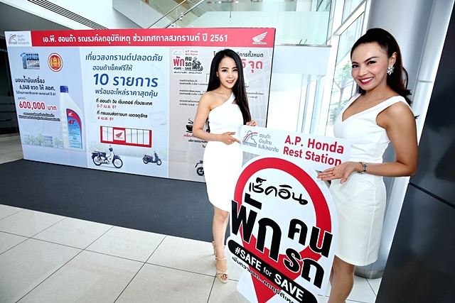 เอ.พี. ฮอนด้า ผู้จัดจำหน่ายรถจักรยานยนต์ฮอนด้าในประเทศไทย เปิดโครงการรณรงค์ลดอุบัติเหตุทางถนนในช่วงเทศกาลสงกรานต์ประจำปี 2561 เผยภารกิจใหญ่ตั้งเป้าคนไทยเดิน ทางปลอดภัยทั่วไทย มุ่งสร้างวัฒนธรรม "สังคมหัวแข็ง" แก่ผู้เดินทาง ชูแนวคิดหลัก "SAFE for SAVE พักคน พักรถ เพิ่มความสด... ลดอุบัติเหตุ" เปิดจุดพักรถ A.P. Honda Rest Station ให้บริการเครื่องดื่มและเช็คความพร้อมรถจักรยานยนต์ บนเส้นทางหลัก ขาออกกรุงเทพฯ 5 จุด, บริการ "ฟรีเซอร์วิส" ตรวจเช็ครถจักรยานยนต์ฟรี 10 รายการ ที่ศูนย์ Honda Wing Center กว่า 1,000 แห่ง รวมถึงบริการนอกสถานที่ ณ กรมการขนส่งทางบก เขตจตุจักร ตลอดจนสนับสนุนโครงการ "อาชีวะอาสาบริการประชาชน" มอบน้ำมันเครื่องจำนวน 6,048 ขวด มูลค่ากว่า 600,000 บาท ให้กับสำนักงานคณะกรรมการการอาชีวศึกษา พร้อมผนึกกำลังผู้แทนจำหน่ายฯ จัดฝึกอบรมนักเรียนและนักศึกษาก่อนเตรียมออกหน่วยให้บริการประชาชน 252 แห่งทั่วประเทศ