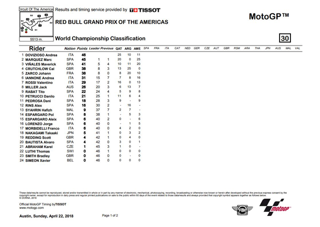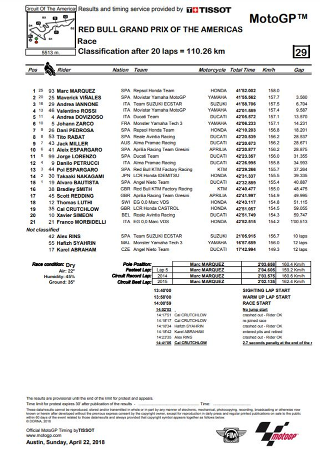 ผลการแข่งขันประจำสนามที่ 2 MotoGP 2018
