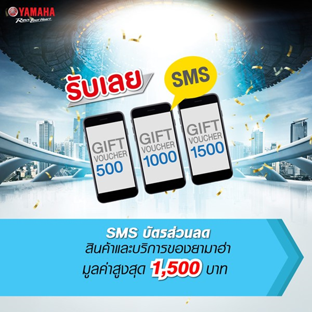 สุดพิเศษ รับทันที!! สำหรับลูกค้าที่ซื้อรถจักรยานยนต์ยามาฮ่ารุ่น M-SLAZ , FINN และ QBIX จะได้รับ SMS บัตรกำนัลส่วนลดในการซื้อสินค้าหรือบริการจากยามาฮ่า มูลค่าสูงสุด 1,500 บาท