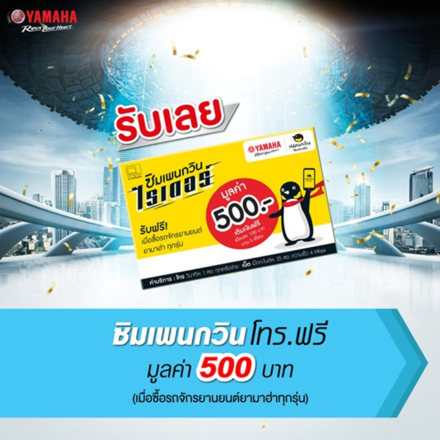 บริษัท ไทยยามาฮ่ามอเตอร์ จำกัด จัดโปรโมชั่นสุดพิเศษ ภายใต้แคมเปญ ยามาฮ่าสร้าง ปรากฏการณ์ทะลุฟ้า 50 ล้าน ซื้อปุ๊ป ได้ปั๊ป ทั้งรับ ทั้งลุ้น! เพียงซื้อรถจักรยานยนต์ยามาฮ่า M-Slaz, QBIX และ FINN รุ่นใดก็ได้ ระหว่างวันที่ 28 มี.ค. 61 - 31 พ.ค. 61 นี้ รับโปรโมชั่นสุดพิเศษดังนี้รับทันที! ซิมเพนกวินพร้อมค่าโทร 500 บาท เมื่อซื้อรถจักรยานยนต์ยามาฮ่ารุ่นใดก็ได้