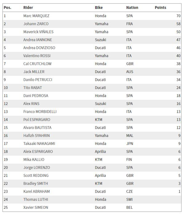 ผลจากการแข่งขันในสนามที่ 4 นี้ทำให้อันดับคะแนนสะสมรวม Marquez จาก Repsol Honda Team ขึ้นมาเป็นผู้นำด้วยคะแนนรวม 70 แต้ม ตามมาด้วย Zarco จากทีม Monster Yamaha Tech 3 ด้วยคะแนน 58 แต้ม ส่วนอันดับ 3 เป็น Vinales จากทีม Movistar Yamaha MotoGP ด้วยคะแนน 50 แต้ม