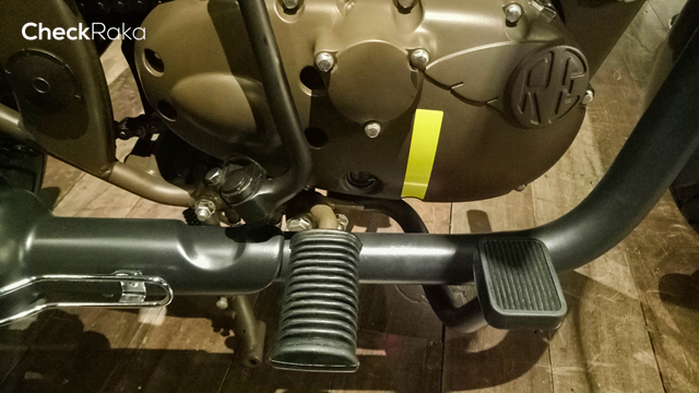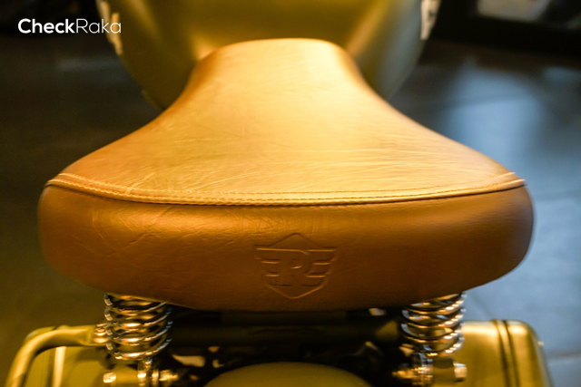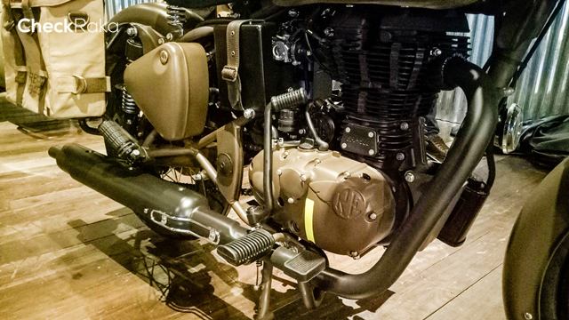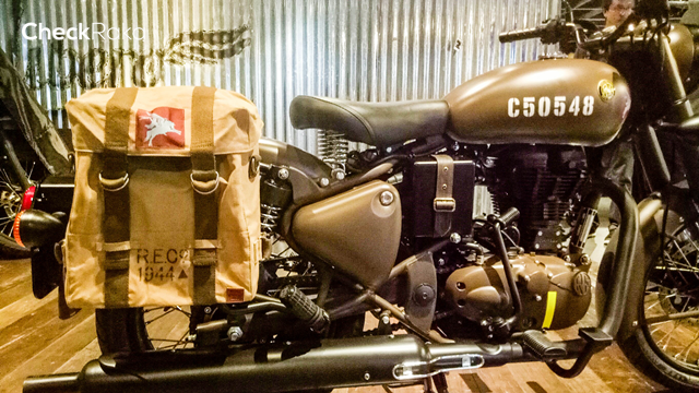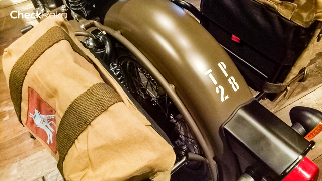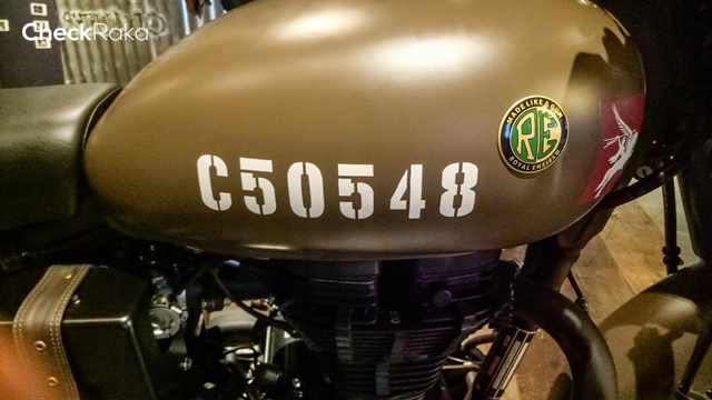 ลวดลาย Made Like a Gun ที่ฝากล่องแบตเตอรี่ รอยัลเอนฟิลด์ คลาสสิก 500 เพกาซัส (Royal Enfield Classic 500 Pegasus) มาพร้อมกระเป๋าข้างสไตล์มิลิทารี่ ทำจากผ้าแคนวาสและปักด้วยโลโก้เพกาซัส รถถูกออกแบบในสไตล์มิลิทารี่เช่นเดียวกัน โดยเริ่มจากไฟหน้าดวงใหญ่ทรงกลมครอบไฟด้วยสายรัดสีดำ มาตรวัดทรงกลมแยกฟังก์ชั่นต่างๆ แฮนด์จับสีน้ำตาล สายรัดหนังพร้อมหัวทองเหลืองบนตัวกรองอากาศ ท่อไอเสีย ล้อ คันสตาร์ท แป้นเหยียบ สะท้อนสไตล์แบบยุคสงครามโลก