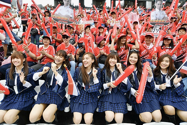 ในครั้งนี้ทีมเชียร์คนไทยจัดเต็มยกทัพกว่า 300 คน พร้อมกับผู้นำเชียร์ "BNK48" ประกอบด้วย "น้องเนย" "น้องอร" "น้องก่อน" "น้องน้ำหนึ่ง" "น้องน้ำใส" "น้องตาหวาน" เพื่อกำลังใจให้ทีมแข่งเอ.พี.ฮอนด้า เรซซิ่ง ไทยแลนด์ได้เป็นอย่างดี
