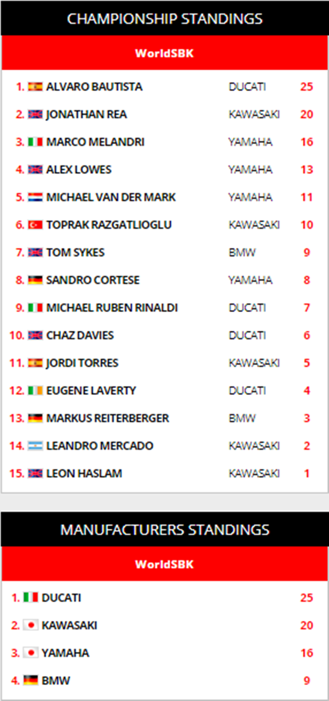 สำหรับการแข่งขันเรซ 2 ของ Yamaha Finance Australian Round ที่สนาม Phillip Island Grand Prix Circuit ที่จะเกิดขี้นในวันอาทิตย์ Bautista จะยังคงฟอร์มร้อนแรงในรถ Ducati Panigale V4 R หรือว่าแชมป์เก่าอย่าง Rea ที่มากับ Kawasaki ZX-10RR จะแผลงฤทธิ์แบ่งโพเดี้ยมที่ Phillip Island ได้มั้ย ก่อนมาแข่งกันสนามที่ 2 ใน Pirelli Thai Round ระหว่างวันที่ 15-17 มีนาคม ที่ สนามช้างฯ ประเทศไทย แฟนๆ มอเตอร์สปอร์คงต้องมาร่วมลุ้นกันตารางคะแนน Championship Standings