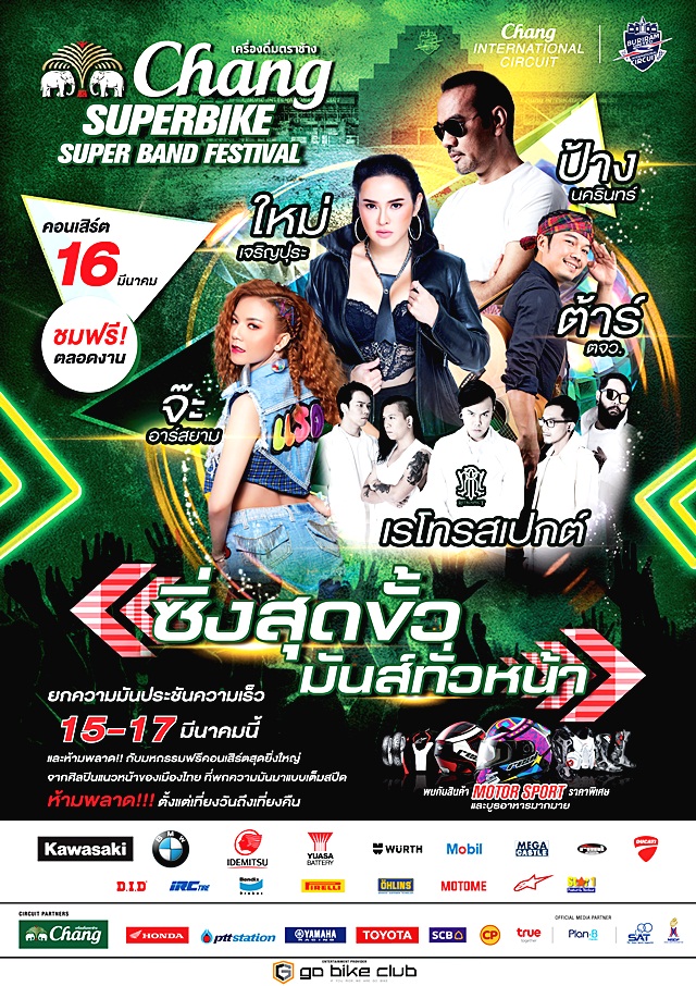 พบกับ "ช้าง ซูเปอร์ไบค์ ซูเปอร์แบนด์ เฟสติวัล" ซิ่งสุดขั้ว มันส์ทั่วหน้า ชมฟรีวันที่ 16 มีนาคม มหกรรมคอนเสิร์ตสุดมันส์จากศิลปินชั้นนำของเมืองไทย ที่พกความมันมาแบบเต็มสปีด ทั้ง เรโทรสเปกต์, จ๊ะ อาร์สยาม, ต้า ตจว., ใหม่ เจริญปุระ และ ป้าง นครินทร์ ห้ามพลาด!! ตั้งแต่เที่ยงวันถึงเที่ยงคืน พบกับกิจกรรม Sexy Car Wash จากนางแบบสุดแสนน่ารัก และพบกับสินค้าและอุปกรณ์ตกแต่งรถจักรยานยนต์ ราคาพิเศษ บูธกิจกรรมจากผู้สนับสนุนที่จะมาสร้างความสนุกให้กับทุกท่านภายในงาน และร้านอาหาร เครื่องดื่มอีกมากมาย และการแข่งขันในปีนี้เข้มข้นขึ้นอีก ด้วยการกลับมาของทีมโรงงานยักษ์ใหญ่อย่าง "ฮอนด้า"