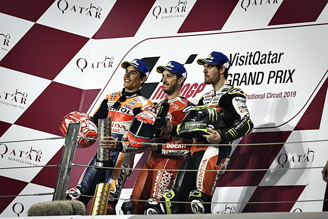การแข่งขัน MotoGP 2019 ใน VisitQatar Grand Prix ประเทศการ์ต้า สิ้นสุดลงโดย 3 นักบิดระดับหัวแถว Dovizioso, Marquez และ Crutchlow ยืนโพเดี้ยมได้ ส่วน Alex Rins รับที่ 5 และ Valentino Rossi จบที่ 5