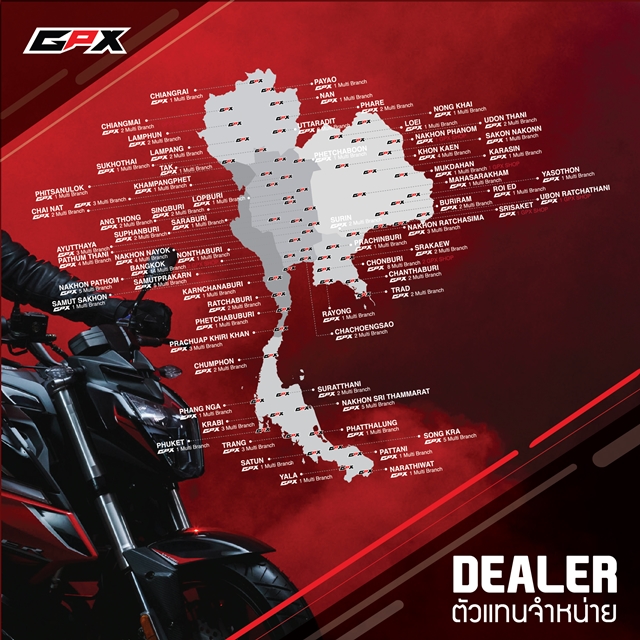 GPX มีตัวแทนจำหน่ายกระจายอยู่ทั่วประเทศกว่า 300 สาขา ซึ่งสามารถคลิ๊ก! ดูข้อมูลรายชื่อ ที่อยู่ และเบอร์โทรติดต่อ ได้ที่