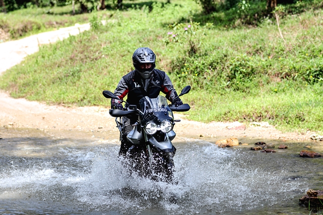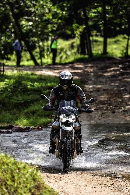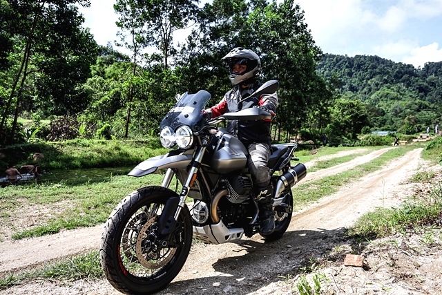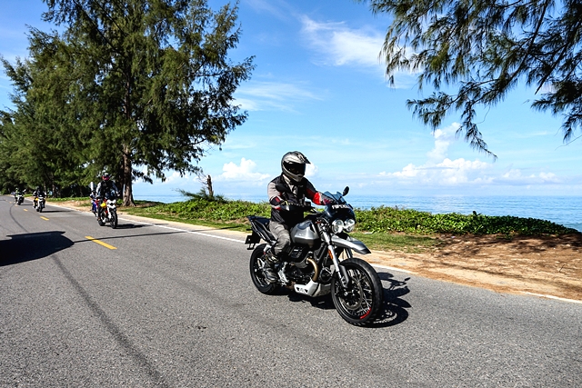 MOTO GUZZI V85 TT ทั้งหมด 12 คัน ขบวนทยอยออกตัวจากโรงแรมบาบาบีช ภูเก็ตไปตามถนนหลักไม่นานก็ตัดเข้าสู่ถนนสายรองและทางขึ้น-ลงเขา เพื่อไปชมและสัมผัสความมหัศจรรย์ของธรรมชาติ บ่อน้ำพุร้อนปลายพู่ ที่เที่ยวลับแห่งเมืองพังงา ที่ซ่อนตัวอยู่ในอำเภอกะปง ระยะทางช่วงแรกเกือบ 80 กม. นับเป็นช่วงสร้างความคุ้นเคยกับตัวรถ จริงๆ ขี่ไปไม่นานก็คุ้นชิน เพราะมีแรงบิดที่ดีเยี่ยมตั้งแต่รอบต้น เบาะนั่งไม่สูงมากทำให้เท้าวางพื้นได้มั่นคงพอ (ผู้เขียนสูง 173 ซม.) ช่วงล่างนุ่มนวลแน่นหนึบ ยางเกาะถนนดีเยี่ยม แม้เปิดในช่วงทางขึ้นเขา ผ่านโค้งสู่โค้งก็ตาม ขบวนฯ มาจอดพักชื่นชมธรรมชาติ และขี่ผ่านลำธารน้ำกันอย่างสนุกสนาน พบว่าตัวรถให้การควบคุมที่ดี แม้ขี่ผ่านก้อนหินน้อยใหญ่ในน้ำก็ตาม สำหรับรถคันที่ใช้เป็นรุ่นเริ่มต้น สีเทาดำ ราคา 759,000 บาท ยางติดรถเป็นแบบทางเรียบ ก็ยังทำหน้าที่ได้ดีแม้นำมาขี่ทางออฟโรด