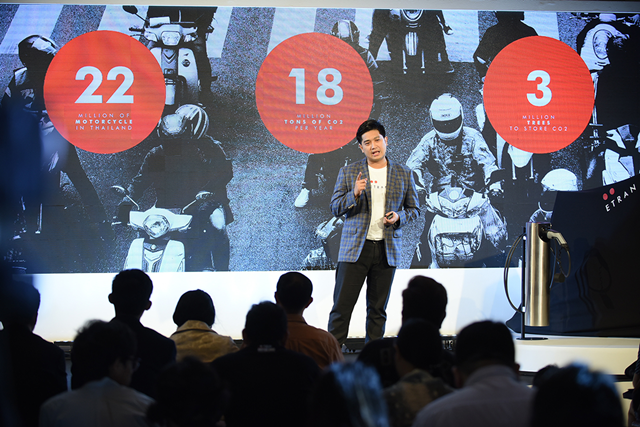 นายสรณัญช์ ชูฉัตร ประธานเจ้าหน้าที่บริหาร บริษัท อีทราน (ไทยแลนด์) จำกัด สตาร์ทอัพสายยานยนต์ ผู้ออกแบบพัฒนารถจักรยานยนต์ไฟฟ้าภายใต้แบรนด์อีทราน (Etran) เปิดเผยว่า จากข้อมูลของกรมขนส่งทางบก พบประเทศไทยมีรถจักรยานยนต์อยู่กว่า 22 ล้านคัน ซึ่งรถจักรยานยนต์ 1 คัน โดยเฉลี่ยจะปล่อย ก๊าซคาร์บอนไดออกไซด์ที่เกิดจากการเผาไหม้ออกสู่ชั้นบรรยากาศถึง 45 กรัมต่อระยะทาง 1 กิโลเมตร ทั้งนี้ หากผู้ขับขี่ 1 คน ใช้รถจักรยานยนต์เป็นระยะทาง 50 กิโลเมตรต่อวัน จะผลิตก๊าซคาร์บอนไดออกไซค์กว่า 2 กิโลกรัมต่อคนต่อวัน ซึ่งโดยรวมผู้ใช้งานรถจักรยานยนต์จะผลิตก๊าซคาร์บอนไดออกไซด์สู่ชั้นบรรยากาศทั้งหมด 5 หมื่นตันต่อวัน หรือ 18 ล้านตันต่อปี และเพื่อดูดซับก๊าซคาร์บอนไดออกไซด์จากชั้นบรรยากาศโลก จะต้องใช้ต้นไม้สูงใหญ่กว่า 6 เมตร จำนวนถึง 3,000 ล้านต้น ดังนั้น ปัญหามลภาวะทางอากาศที่เกิดจากการใช้รถต่างๆ ในชีวิตประจำวันจะยังคงเกิดขึ้นอย่างต่อเนื่อง