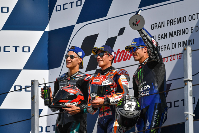 Marc Marquez ทีม Repsol Honda เป็นผู้ชนะในการแข่งขัน GP Octo di San Marino e della Riviera di Rimini หลังต้องไล่ตาม Fabio Quartararo ทีม Petronas Yamaha SRT เกือบตลอดทั้งเกม ก่อนจะสอนมวยให้รุ่นน้องในรอบสุดท้ายพร้อมเป็นผู้ชนะไปในที่สุด ส่วน Maverick Vinales ทีม Monster Energy Yamaha MotoGP จบการแข่งขันในอันดับที่ 3