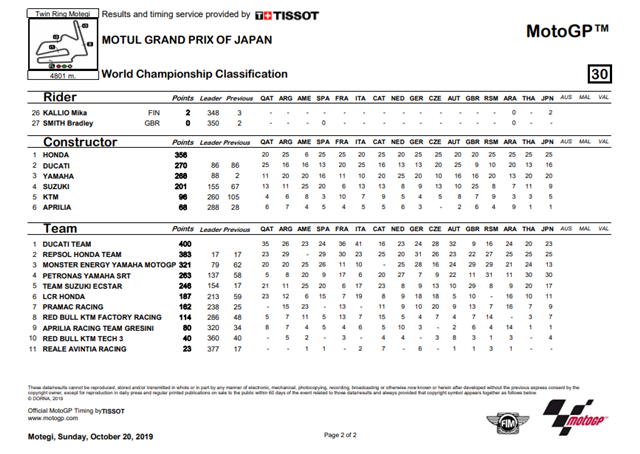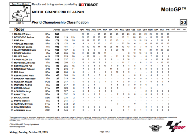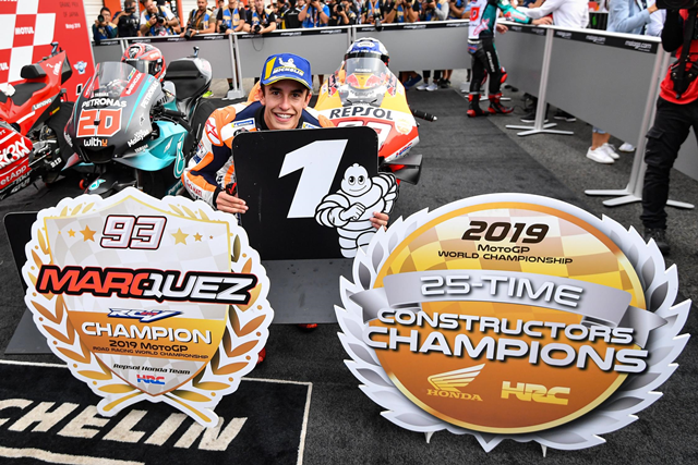 การชนะของ Marquez ทำให้ Honda ในปีนี้ได้ Double Crown ด้วยการคว้าแชมป์ประเภทผู้ผลิต ส่วน Quartararo ก็คว้าตำแหน่ง Rookie of The Year ต่อจากนี้ก็เหลืออีกแชมป์ที่ต้องลุ้นกันว่าใครจะคว้าไปได้นั้นก็คือ แชมป์ประเภททีม ระหว่าง Ducati Team และ Repsol Honda Team เป็นความสนุกของการแข่งขัน MotoGP ในปี 2019 ที่มีให้แฟนๆ ได้ติดตามกันต่อไป