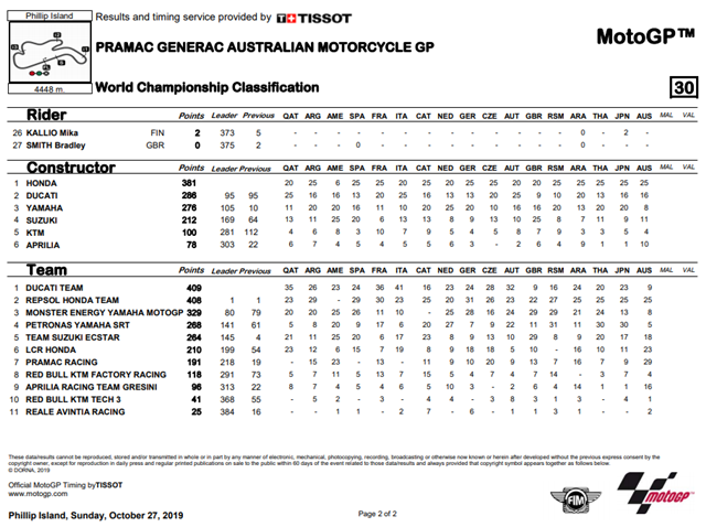 Marquez ยังคงเก็บคะแนนได้อย่างต่อเนื่องเพื่อพา ทีม Repsol Honda คว้าตำแหน่งแชมป์ประเภททีมให้ได้สำเร็จ โดยตามผู้นำอย่าง ทีม Ducati อยู่เพียง 1 แต้ม เท่านั้น ส่วนสนามหน้าจะเป็นรายการ Shell Malaysia Motorcycle Grand Prix ที่ Sepang International Circuit ประเทศมาเลเซียซึ่งเป็นสนามรองสุดท้ายแล้วสำหรับปี 2019 จะเป็นอย่างไรต้องติดตามให้ดี
