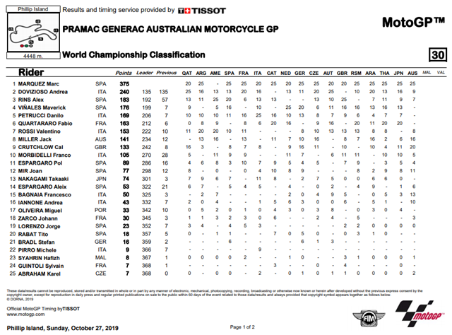 โมโตจีพี.คอม ผลการแข่งขัน MotoGP รายการ Pramac Generac Australian Motorcycle Grand Prix ที่สนาม Phillip Island