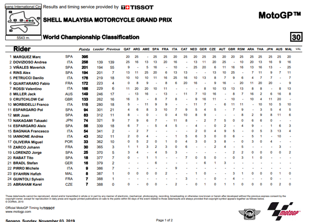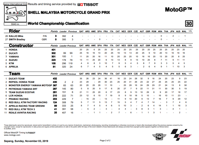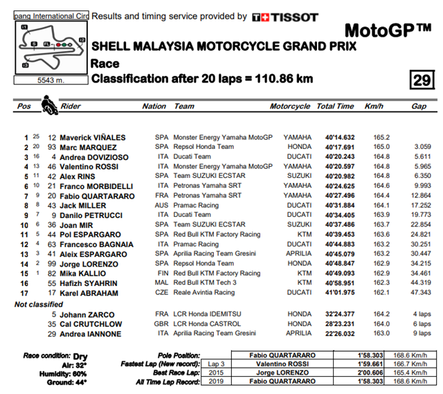 โมโตจีพี.คอม ผลการแข่งขัน MotoGP รายการ Shell Malaysia Motorcycle Grand Prix ที่สนาม Sepang International Circuit