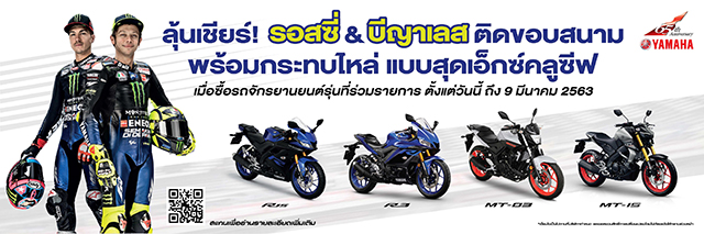 บริษัท ไทยยามาฮ่ามอเตอร์ จำกัด จัดบิ๊กแคมเปญเอาใจสาวกมอเตอร์สปอร์ตระดับโลก เมื่อซื้อรถจักรยานยนต์ยามาฮ่า R-Series รุ่น YZF-R3, YZF-R15 หรือ MT-Series รุ่น MT-03, MT-15 ระหว่างวันที่ 1 กุมภาพันธ์ ถึง 9 มีนาคม 2563 และกรอกข้อมูลผ่านทาง QR Code ให้ถูกต้องและครบถ้วน มีสิทธิ์ลุ้นรับบัตรเข้าชมการแข่งขัน MotoGP ที่จัดขึ้นในเมืองไทย รายการ OR THAILAND GRAND PRIX 2020 ณ สนามช้าง อินเตอร์เนชั่นแนล เซอร์กิต