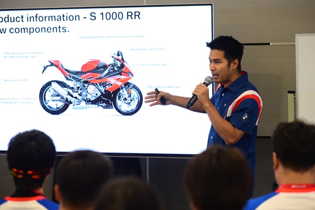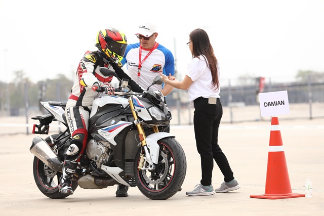 S1000RR รุ่นล่าสุด ที่มีพลังระดับ 207 แรงม้า กับน้ำหนักตัวไม่ถึง 200 กก. ภาพรวมของการฝึกระดับ 1 และแบบฝึกหัดแรกจากทั้งหมด 5 หัวข้อ ก่อนลงสู่การขี่จริงในสนาม ซึ่งแต่ละคนจะมีโค้ชประจำลงไปขี่สังเกต และแนะนำระหว่างฝึกอาศัยผ่านสัญญาณมือซึ่งได้อธิบายกันในห้องเรียนให้เข้าใจร่วมกันไว้แล้ว หลังจากขี่เสร็จกลับมาจอดรถในจุดจอดเรียบร้อยก็ต้องรีบมารายงานผลการฝึกกับโค้ชของตนเองทันที เพื่อสอบถามและฟังข้อแก้ไขต่างๆ จากโค้ช จากนั้นก็ต้องกลับขึ้นไปที่ห้องเรียนเพื่อฟังหัวข้อการฝึกถัดไป แล้วจึงลงมาขี่ฝึกตามหัวข้อนั้นๆ วนไปจนครบ 5 หัวข้อ เรียกว่าต้องพร้อมกันตั้งแต่เช้ายันเย็น โดยเริ่มจากหัวข้อดังต่อไปนี้