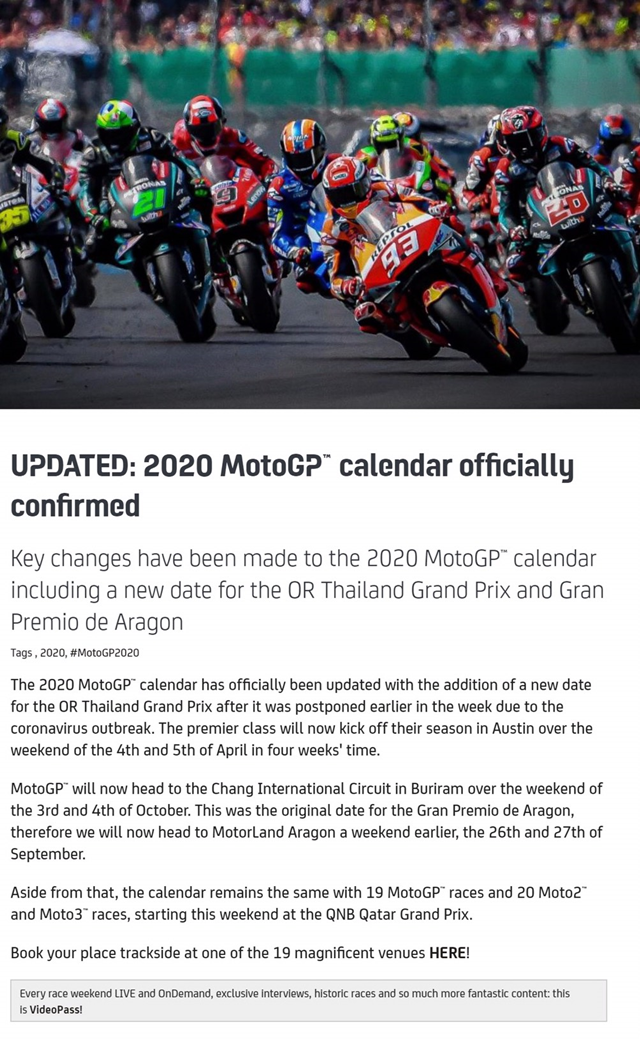 ล่าสุดได้มีการยืนยันออกมาแล้วจาก เอฟไอเอ็ม, สมาคมทีมแข่งจักรยานยนต์นานาชาติและ ดอร์น่า สปอร์ต เจ้าของลิขสิทธิ์การจัดการแข่งขัน MotoGP ได้ประกาศปรับเปลี่ยนตารางการแข่งขัน OR Thailand Grand Prix 2020 ที่จะจัดขึ้นในประเทศไทย โดยกำหนดการอย่างเป็นทางการนั้นได้เลื่อนไปเป็นสนามที่ 16 ระหว่างวันที่ 2-4 ตุลาคม 2563 ณ สนามช้าง อินเตอร์เนชั่นแนล เซอร์กิต จ.บุรีรัมย์.png)