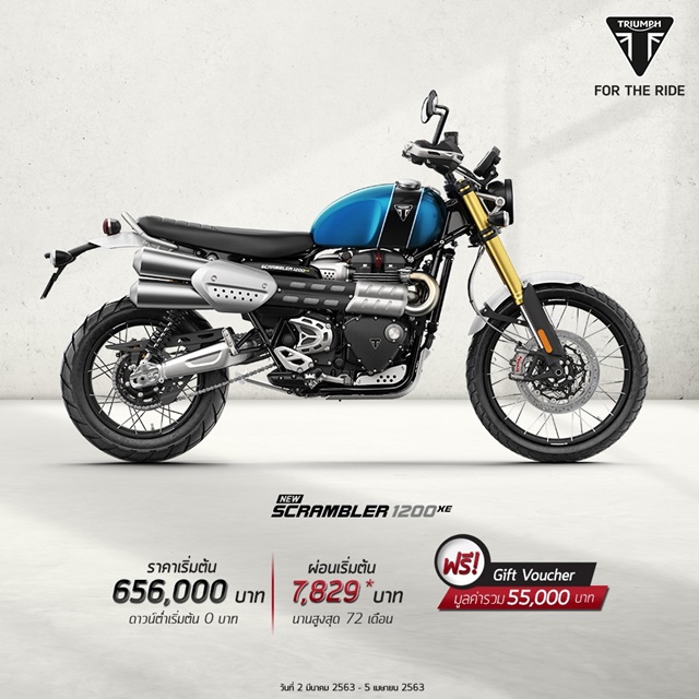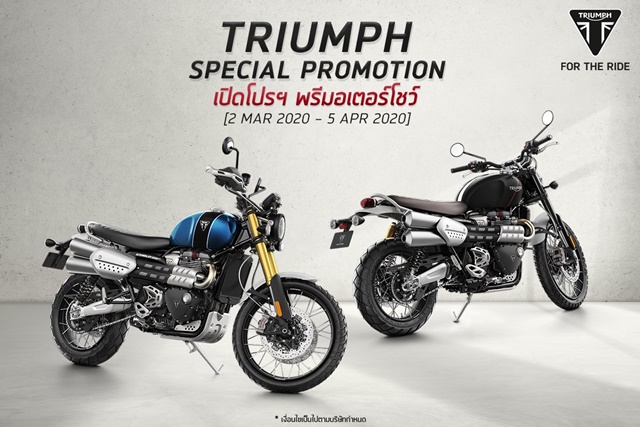 ไทรอัมพ์ มอเตอร์ไซเคิลส์ มอบข้อเสนอสุดเร้าใจในการเป็นเจ้าของรถมอเตอร์ไซค์ไทรอัมพ์ โมเดิร์นคลาสสิกหลากหลายรุ่น ประจำเดือนมีนาคม 2563- ประเดิมที่รถมอเตอร์ไซค์โมเดิร์นคลาสสิกที่เป็นที่สุดของการขับขี่เพื่อสายลุยตัวจริง สแครมเบลอร์ 1200 เอ็กซ์ซี (Scrambler 1200 XC) ราคา 613,000 บาท และ สแครมเบลอร์ 1200 เอ็กซ์อี (Scrambler 1200 XE) ราคา 656,000 บาท รับฟรีทันที Gift Voucher แทนเงินสดมูลค่า 50,000 บาท พร้อม Gift Voucher สำหรับเสื้อผ้า มูลค่า 5,000 บาท