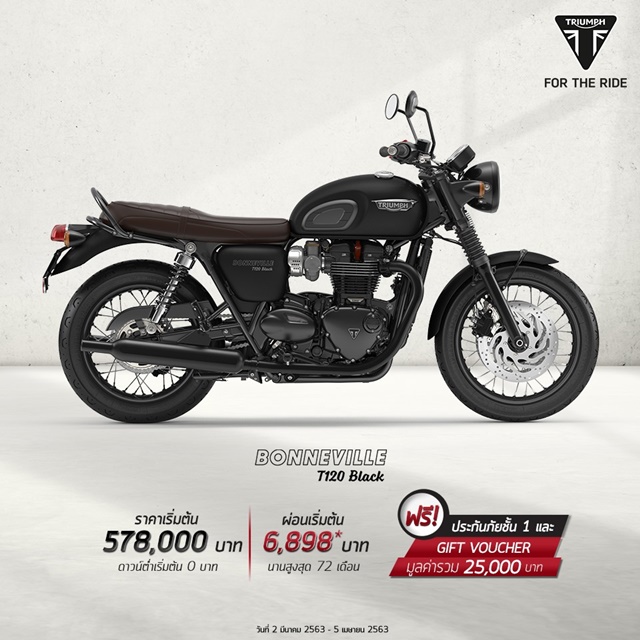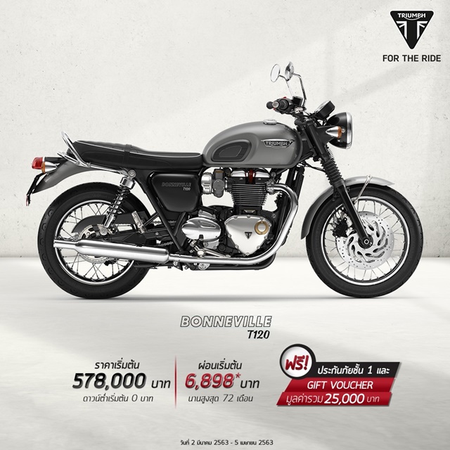 - ตามมาด้วย บอนเนวิลล์ ที120 และ บอนเนวิลล์ ที120 แบล็ค (Bonneville T120 & Bonneville T120 Black) ราคาเริ่มต้นที่ 578,000 บาท รับฟรี Gift Voucher แทนเงินสดมูลค่า 20,000 บาท พร้อม Gift Voucher สำหรับเสื้อผ้า มูลค่า 5,000 บาท รวมถึงประกันภัยชั้น 1