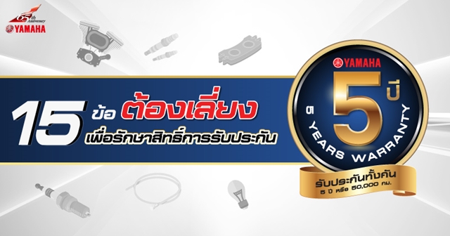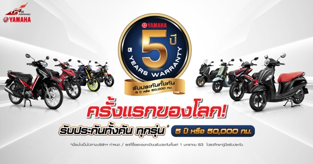 Yamaha แบรนด์รถจักรยานยนต์ที่กล้ารับประกันคุณภาพรถจักรยานยนต์มากที่สุดถึง 5 ปี หรือระยะทาง 50,000 กม. ครั้งแรกของโลก!!.. เพื่อความมั่นใจและการใช้งานที่คุ้มค่ามากที่สุดสำหรับลูกค้า และสิ่งที่สำคัญที่สุดสำหรับลูกค้านั่นคือ การใช้งานที่ถูกต้องตามคำแนะนำของยามาฮ่า เพื่อให้รักษาระยะเวลาการรับประกันไว้ให้คุ้มค่าเช่นกัน