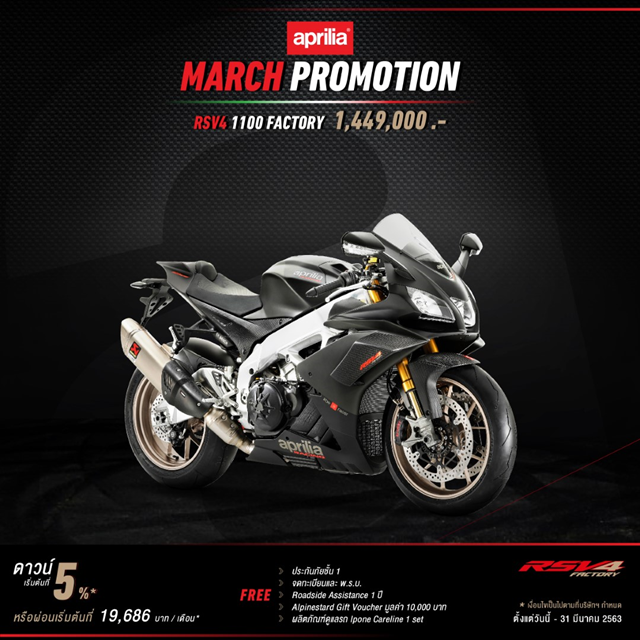 Aprilia สุดยอดมอเตอร์ไซค์สัญชาติอิตาเลียน จัดโปรโมชั่นประจำเดือนมีนาคม 2563