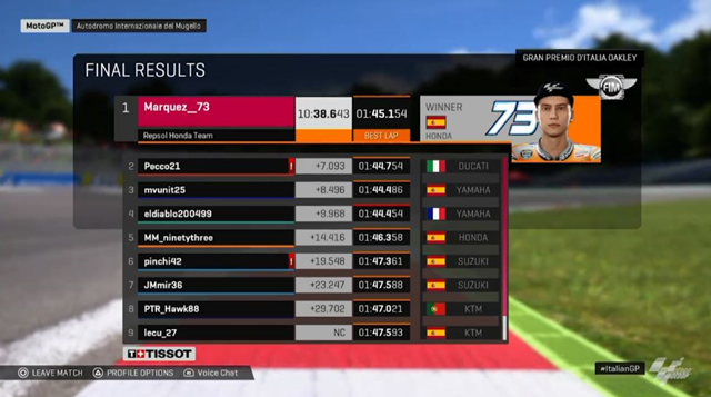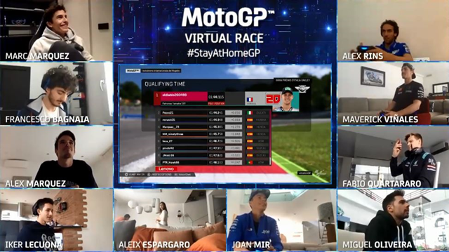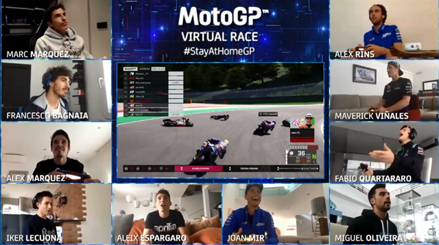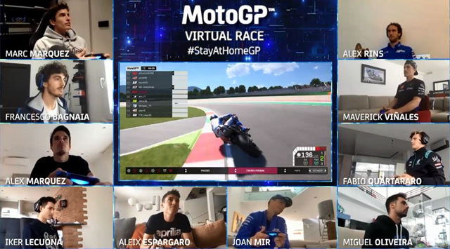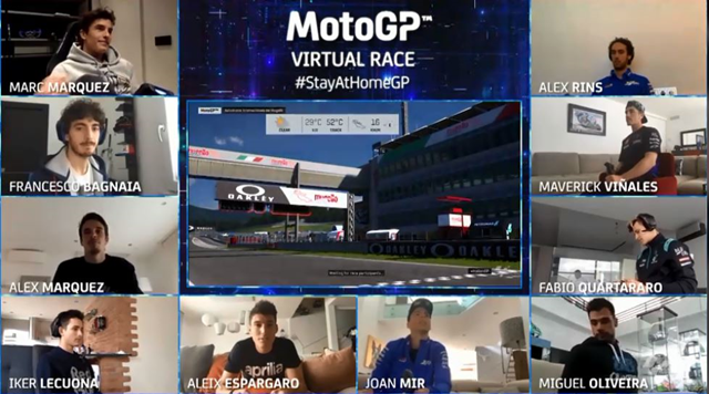ในเมื่อ Covid-19 ทำให้การแข่งขันในสนามจริงต้องเลื่อนออกไปในช่วงนี้ เลยมีการเอาบรรดานักแข่งในศึก MotoGP มาจับจอยแข่งกันในเกมด้วยไอเดีย #StayAtHomeGP โดยเปิดสนามนัดแรกที่ Autodromo Internazionale del Mugello ที่อยู่ในอิตาลี โดยมีนักแข่ง 10 รายเข้าร่วม ได้แก่ 2 พี่น้องตระกูล มาร์เกซ อย่าง มาร์ค และ อเล็กซ์ จาก Honda, มาเวอร์ริค วิญญาเลส กับ ฟาบิโอ ควอตาราโร่ จาก Yamaha, ฟรานเชสโก้ บัญญาญ่า จาก Ducati, อเล็กซ์ รินส์ กับ โจอัน เมียร์ จาก Suzuki, มิเกล โอลิเวร่า คู่กับ อิเค เลกัวน่า จาก KTM ปิดท้ายด้วย อเล็กซิส เอสเปกาโร่ จาก Aplilia
