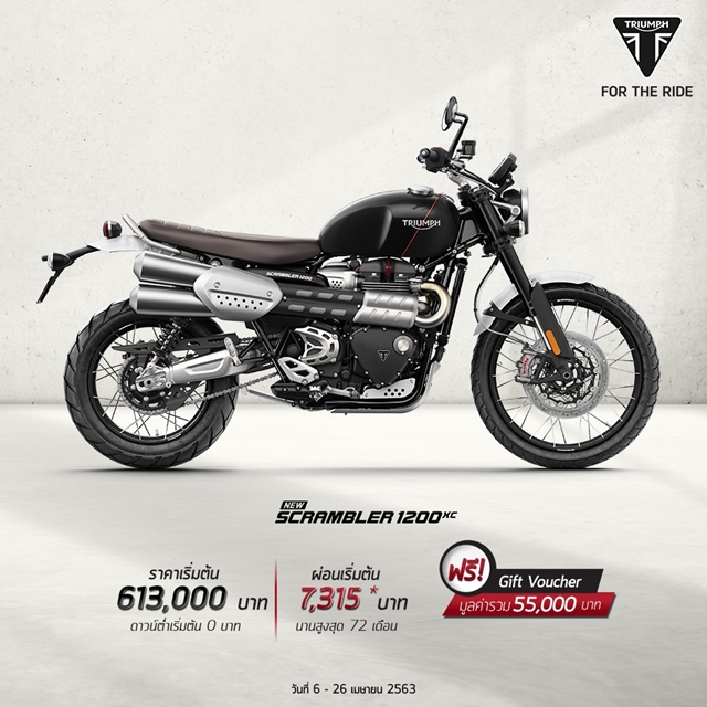- สแครมเบลอร์ 1200 เอ็กซ์ซี (Scrambler 1200 XC) ราคา 613,000 บาท และ สแครมเบลอร์ 1200 เอ็กซ์อี (Scrambler 1200 XE) ราคา 656,000 บาท มอเตอร์ไซค์โมเดิร์นคลาสสิกที่เป็นที่สุดของการขับขี่เพื่อสายลุยตัวจริง รับฟรีทันที Gift Voucher แทนเงินสดมูลค่า 50,000 บาท พร้อม Gift Voucher สำหรับเสื้อผ้า มูลค่า 5,000 บาท
