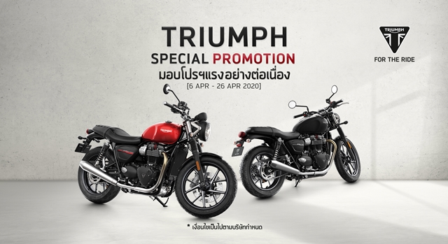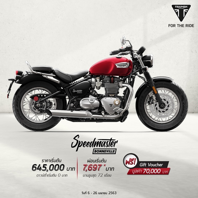 บอนเนวิลล์ สปีดมาสเตอร์ (Bonneville Speedmaster) ราคา 645,000 บาท รับฟรี Gift Voucher แทนเงินสดมูลค่า 70,000 บาทโดยทุกรุ่นข้างต้น ฟรีดาวน์ ดอกเบี้ยต่ำ ผ่อนนานสูงสุด 72 เดือน ตลอดจนรับบริการช่วยเหลือฉุกเฉินบนท้องถนนตลอด 24 ชั่วโมง (Triumph Roadside Assistance) 2 ปี และการรับประกันคุณภาพของรถอีก 2 ปี ไม่จำกัดระยะทาง พร้อมกันนี้ยังมีข้อเสนอพิเศษของรุ่นอื่นๆ อีกมากมายที่จัดหนักจัดเต็ม ทั้งนี้โปรโมชั่นดังกล่าวเริ่มตั้งแต่ วันนี้จนถึงวันที่ 26 เมษายน 2563 ผู้สนใจสามารถสอบถามรายละเอียดเพิ่มเติม ได้ที่โชว์รูมไทรอัมพ์ 14 แห่งทั่วประเทศ