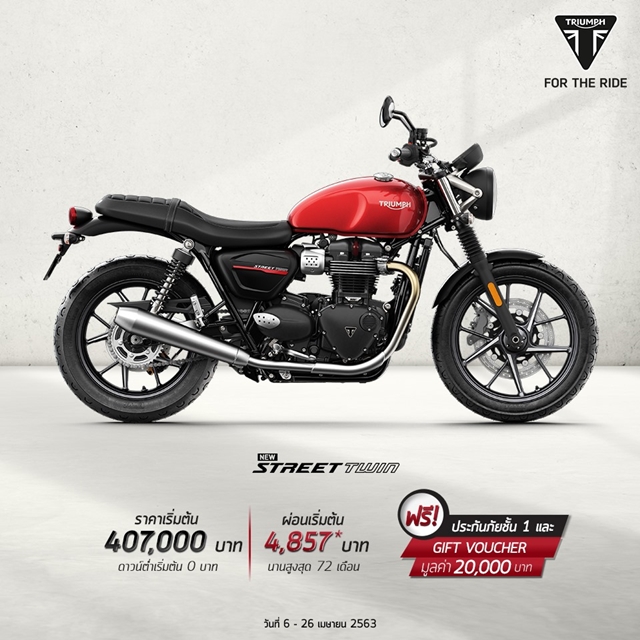 สตรีท ทวิน (Street Twin) ราคาเริ่มต้นที่ 407,000 บาท รับฟรี Gift Voucher แทนเงินสดมูลค่า 20,000 บาท พร้อมประกันภัยชั้น 1