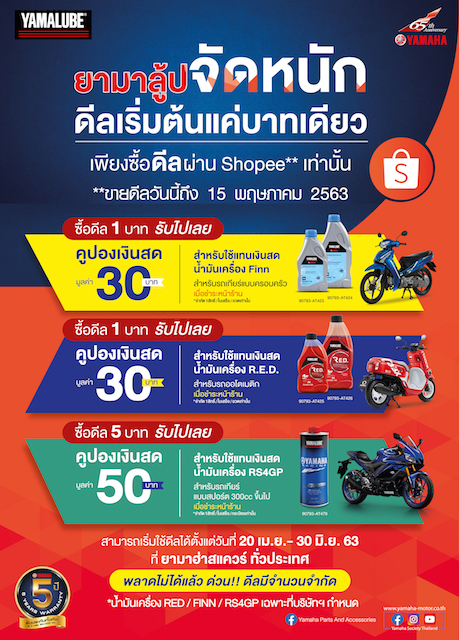 ไทยยามาฮ่ามอเตอร์ ขยายดีลพิเศษช่วยแบ่งเบาภาระลูกค้าที่ยังคงได้รับผลกระทบในภาวะวิกฤตเศรษฐกิจจากไวรัสโคโรน่า 2019 โดยลูกค้าที่สนใจสามารถซื้อดีลคูปองเงินสด ผ่านแอปพลิเคชัน Shopee บนสมาร์ทโฟน ได้จนถึงวันที่ 15 พฤษภาคม นี้ หลังจากที่ บริษัท ไทยยามาฮ่ามอเตอร์ จำกัด ได้จับมือกับผู้จำหน่ายทั่วประเทศ ปล่อยดีลพิเศษเพื่อแลกเป็นคูปองส่วนลด เมื่อซื้อน้ำมันเครื่อง YAMALUBE FINN, YAMALUBE R.E.D และ YAMALUBE RS4GP และได้การตอบรับที่ดีเยี่ยมจากลูกค้ายามาฮ่าทั่วประเทศล่าสุด ไทยยามาฮ่ามอเตอร์ ได้ขยายเวลาจำหน่ายดีลดังกล่าวออกไปจนถึงวันที่ 15 พฤษภาคม นี้ ภายใต้ข้อเสนอเดิมด้วยราคาเริ่มต้นเพียง 1 บาท จะได้รับคูปองเงินสด มูลค่า 30 บาท เพื่อใช้แทนเงินสด เมื่อซื้อน้ำมันเครื่อง YAMALUBE FINN หรือ YAMALUBE R.E.D. ขนาดใดก็ได้รวมถึงลูกค้าที่ซื้อดีลคูปองเงินสดราคา 5 บาท จะได้รับคูปองมูลค่า 50 บาท เพื่อใช้แทนเงินสด เมื่อซื้อน้ำมันเครื่อง YAMALUBE RS4GP โดยลูกค้าจะได้รับคูปองในรูปแบบดิจิทัลเพื่อนำไปใช้ที่ยามาฮ่าสแควร์ ทั่วประเทศ ระหว่างวันที่ 20 เมษายน - 30 มิถุนายน 2563สำหรับลูกค้าที่สนใจสามารถสอบถามข้อมูลเพิ่มเติม และตรวจสอบร้านผู้จำหน่ายจักรยานยนต์ยามาฮ่าสาขาที่ร่วมรายการ ได้ที่เพจ : Yamaha Parts and Accessories อะไหล่รถจักรยานยนต์ยามาฮ่า โดยข้อเสนอพิเศษดังกล่าวมีจำนวนจำกัด และเป็นไปตามเงื่อนไขของบริษัทฯแท็กที่เกี่ยวข้อง :