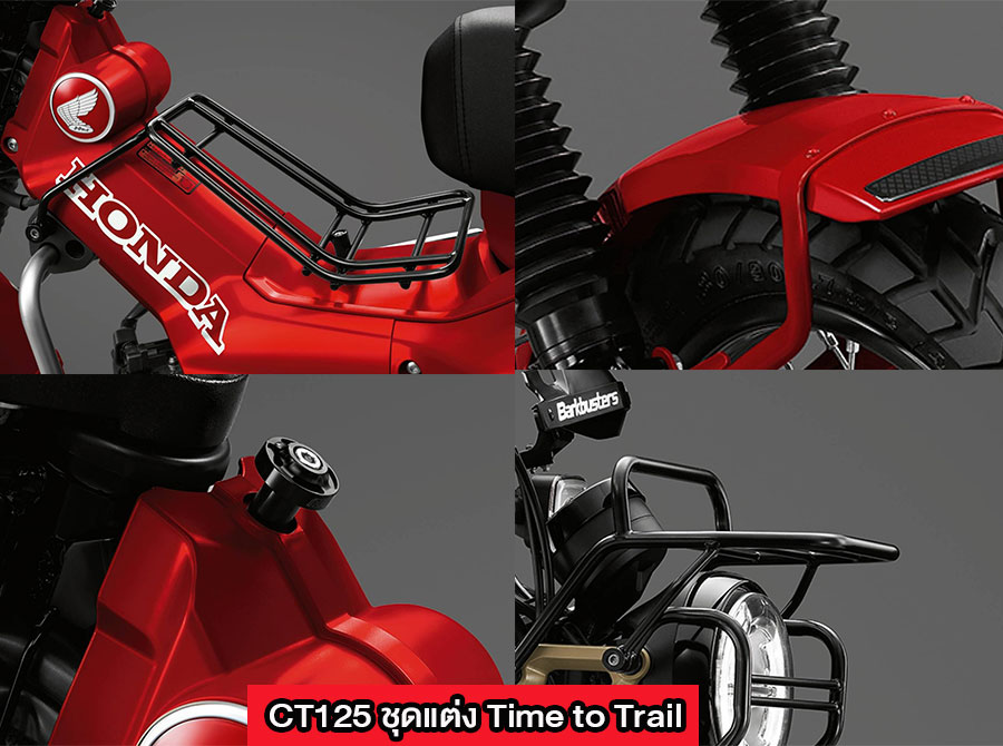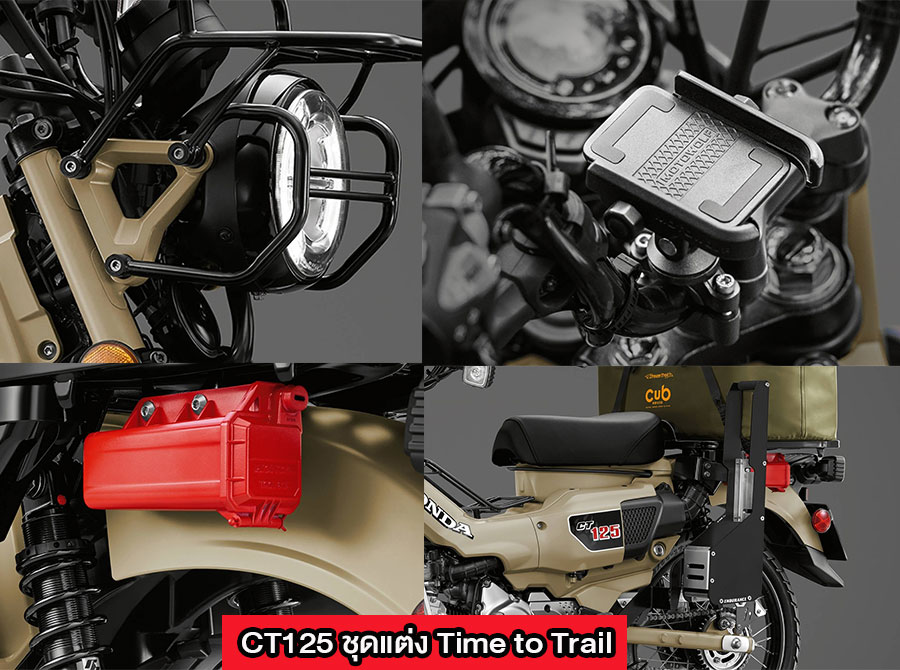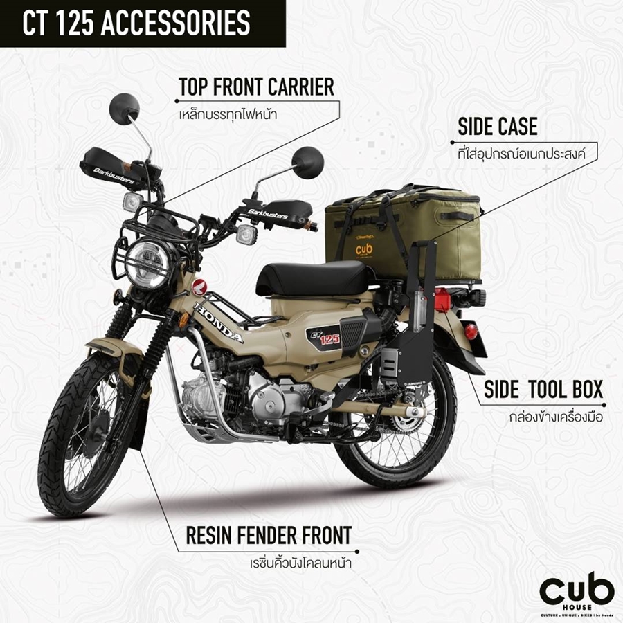 CUB House ร้านไลฟ์สไตล์รูปแบบใหม่ เปิดตัว Accessories ชุดแต่งดีไซน์พิเศษสำหรับ New Honda CT125 โดยเฉพาะ พร้อมวางจำหน่ายแล้ววันนี้เพื่อให้สาวกสายลุยได้ปรับแต่งรถ CT125 ในแบบที่ตัวเองชอบชุดแต่งสุดเอ็กซ์คลูซีฟของ New Honda CT125 ได้รับการออกแบบเพื่อตอกย้ำคอนเซ็ปต์ "Time to Trail ได้เวลาออกนอกเส้นทาง" เปิดโอกาสให้เจ้าของรถสามารถเลือกแต่งได้อย่างหลากหลาย ไม่ว่าจะชอบลุยหรือขับขี่ในเมืองก็สามารถเลือกอุปกรณ์ที่ตอบโจทย์การใช้งานได้อย่างง่ายดาย