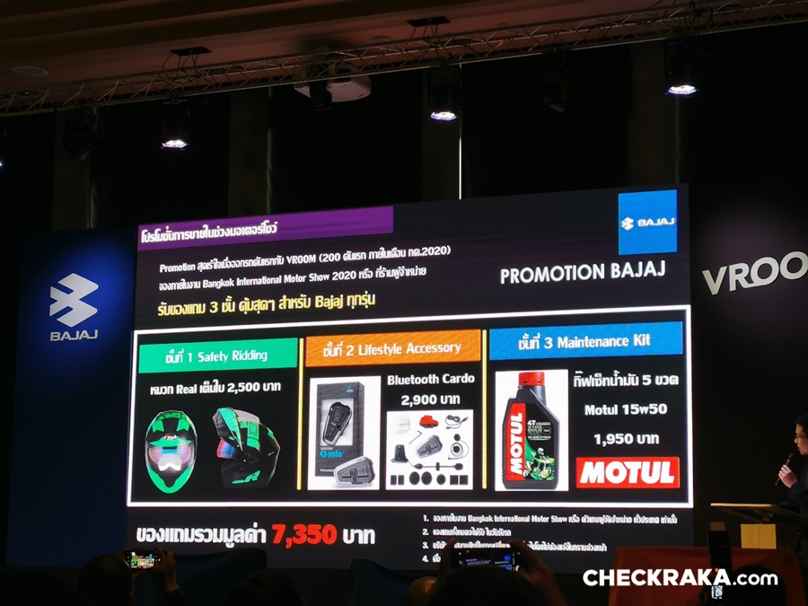 พิเศษในงานบางกอก อินเตอร์เนชั่นแนล มอเตอร์โชว์ ครั้งที่ 41 บริษัทฯ ได้เตรียมแผนส่งเสริมการขายซึ่งเป็นสิทธิพิเศษให้กับผู้ที่สนใจ สำหรับผู้ที่จองรถบาจาจทุกรุ่น ตั้งแต่วันนี้ถึง 31 กรกฎาคม 2563 รับฟรีทันที! ของแถม 3 ชั้นมูลค่ารวม 7,350 บาท