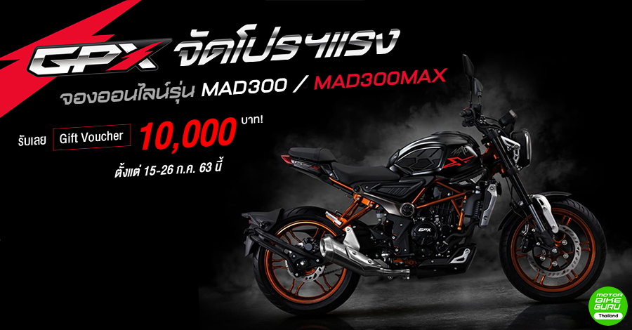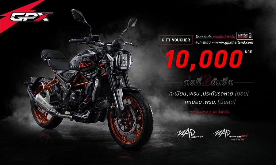 GPX จัดโปรฯ แรง! กับข้อเสนอสุดพิเศษสำหรับผู้ที่จองรถรุ่น MAD300 และ MAD 300MAX ตั้งแต่วันนี้ - 26 ก.ค. 63 นี้โดยข้อเสนอสุดพิเศษนี้เป็นสิทธิพิเศษเฉพาะจองออนไลน์ สนใจรับข้อเสนอด้วยขั้นตอนง่ายๆ เพียงแค่ลงทะเบียนจองรถ รุ่น MAD300 และ MAD 300MAX ผ่านช่องทาง www.gpxthailand.com ก็รับไปเลย! Gift Voucher ส่วนลดพิเศษมูลค่า 10,000 บาท (นำ QR Code ที่ได้จากการลงทะเบียนไปแสดงที่หน้าร้าน เพื่อเป็นส่วนลดจากราคาตัวรถปกติ) พร้อมทั้งสามารถเลือกรับรถได้ที่ตัวแทนจำหน่าย GPX กว่า 300 สาขาทั่วประเทศ