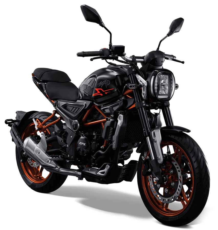 MAD 300 มอเตอร์ไซค์สไตล์ Sport Naked Custom รถรุ่นใหม่ล่าสุดจากค่าย GPX มาพร้อมกับเครื่องยนต์เทคโนโลยีหัวฉีด EFI ในขุมกำลังพิกัด 300 ซีซี 4 จังหวะ ระบายความร้อนด้วยน้ำ เพิ่มประสิทธิภาพการทำงานของเครื่องยนต์ให้เต็มสูบ บิดมันส์ติดมือกับเกียร์ 6 สปีด ดิสก์เบรกหน้าแบบคู่ โช๊คหน้าหัวกลับ Up Side Down ดีไซน์โดดเด่นตอบโจทย์คนไทยรุ่น MAD 300 ราคาแนะนำขายปกติที่ 93,500 บาท