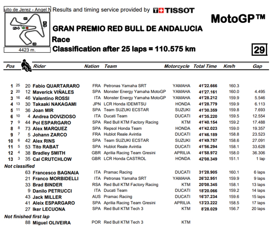 นับเป็นชัยชนะ 2 สนามติดต่อกันของ Fabio Quartararo ทีม Petronas Yamaha SRT ที่สามารถคว่าชัยได้อีกครั้งในการแข่งขันในรายการ Gran Premio Red Bull de Andalucia ตามมาด้วย Maverick Vinales และ Valentino Rossi จากทีม Monster Energy Yamaha MotoGP ถือเป็นชัยชนะของ Yamaha ที่กวาดทุกตำแหน่งไปครองได้สำเร็จ