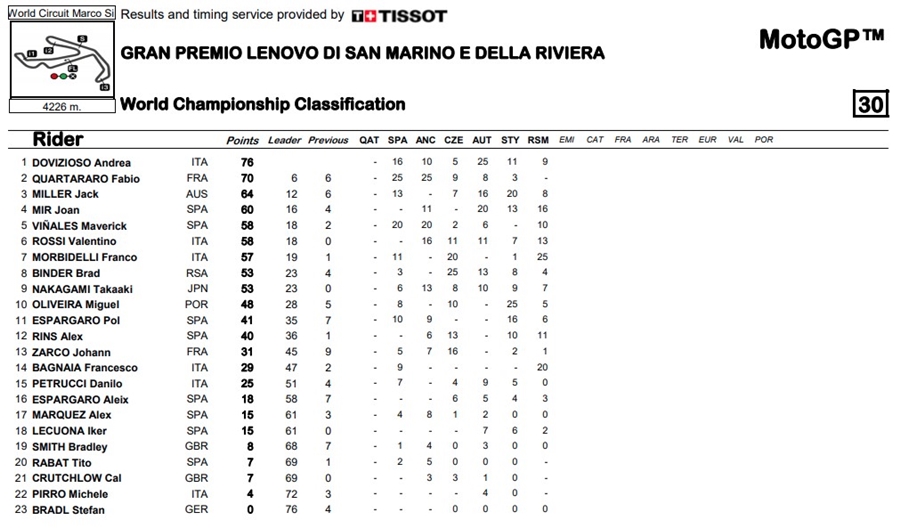 ส่วนคะแนนสะสมกลายเป็น Andrea Dovizioso จาก Ducati Team ที่มีคะแนนสะสมอยู่ที่ 76 แต้ม ขึ้นนำ Quartararo ที่มีคะแนนอยู่ที่ 70 เป็นอีกครั้งที่ฤดูกาล 2020 เป็นเรื่องที่คาดเดาไม่ได้ และการแข่งขันก็มีการเปลี่ยนแปลงอยู่ตลอด รวมถึงการ DNF ของ Quartararo
