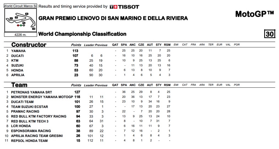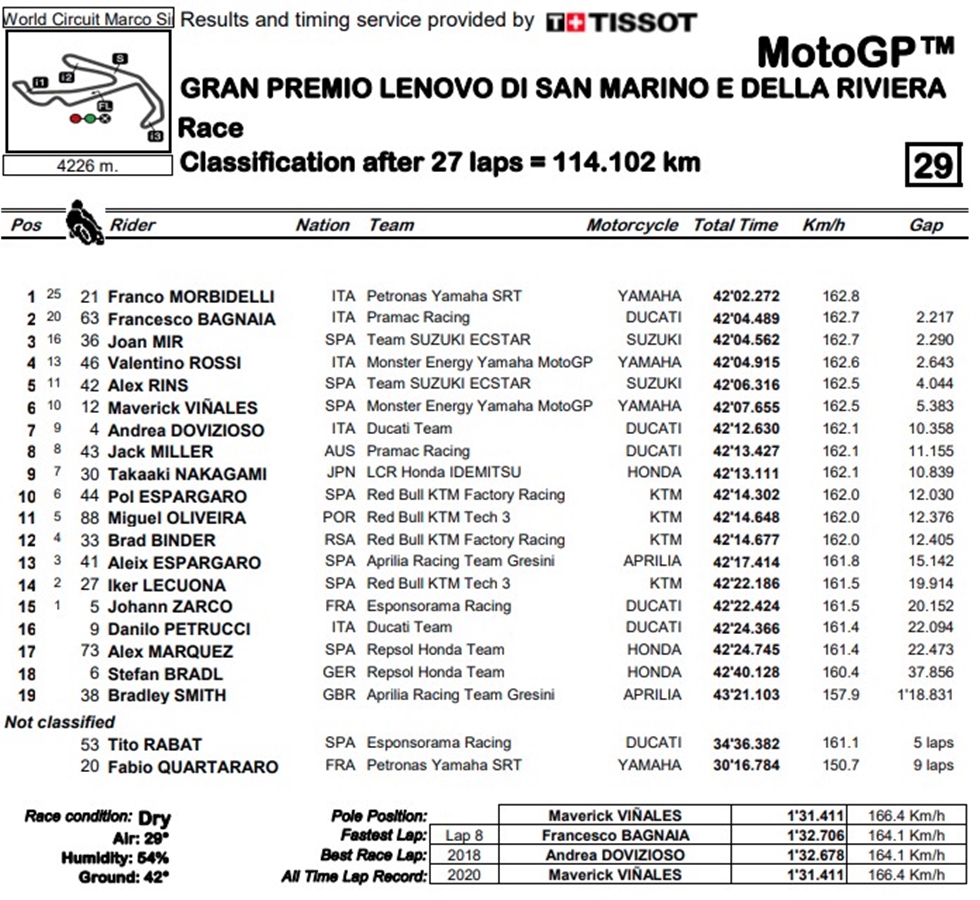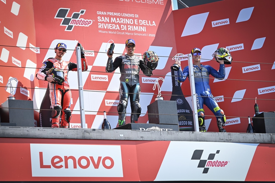 รายการ Gran Premio Lenovo di San Marino e della Riviera di Rimini จัดขึ้นที่สนาม Misano World Circuit Marco Simoncelli ใน อิตาลี นับเป็นความสำเร็จของ Yamaha เมื่อนักแข่งทั้ง 2 ทีมจาก Monster Energy Yamaha MotoGP และ Petronas Yamaha SRT กวาดหัวแถวทั้ง 4 อันดับแรกได้สำเร็จนำโดย Maverick Vinales ทีม Monster Energy Yamaha MotoGP ที่คว้าโพลโพซิชั่น ตามมาด้วย Franco Morbidelli และ Fabio Quartararo จาก Petronas Yamaha SRT และปิดท้ายด้วย เดอะ ด็อกเตอร์ Valentino Rossi ทีม Monster Energy Yamaha MotoGP โดยผลการแข่งขันกลายเป็น Morbidelli ที่คว้าชัยชนะครั้งแรกของ MotoGP นำหน้าเพื่อนร่วมชาติอย่าง Francesco Bagnaia จาก Pramac Racing อยู่ถึง 2.217 วินาที ด้าน Joan Mir จาก Team Suzuki Ecstar ก็สามารถแซง Rossi ได้ในรอบสุดท้ายขึ้นโพเดี้ยมที่ 3 ได้สำเร็จ