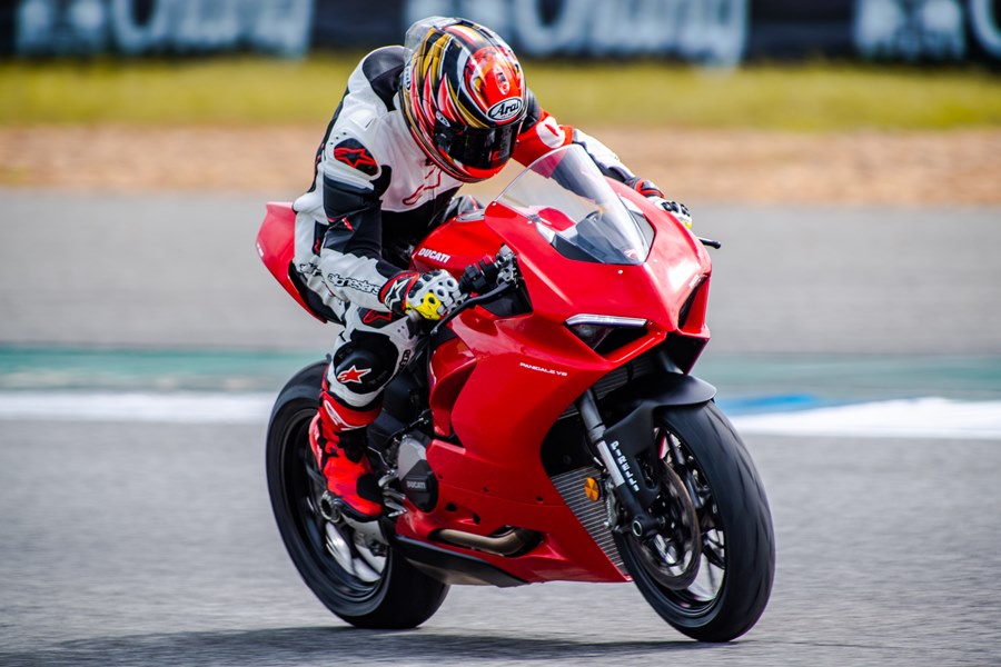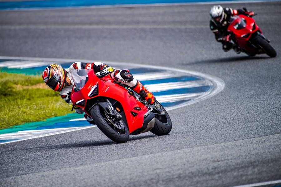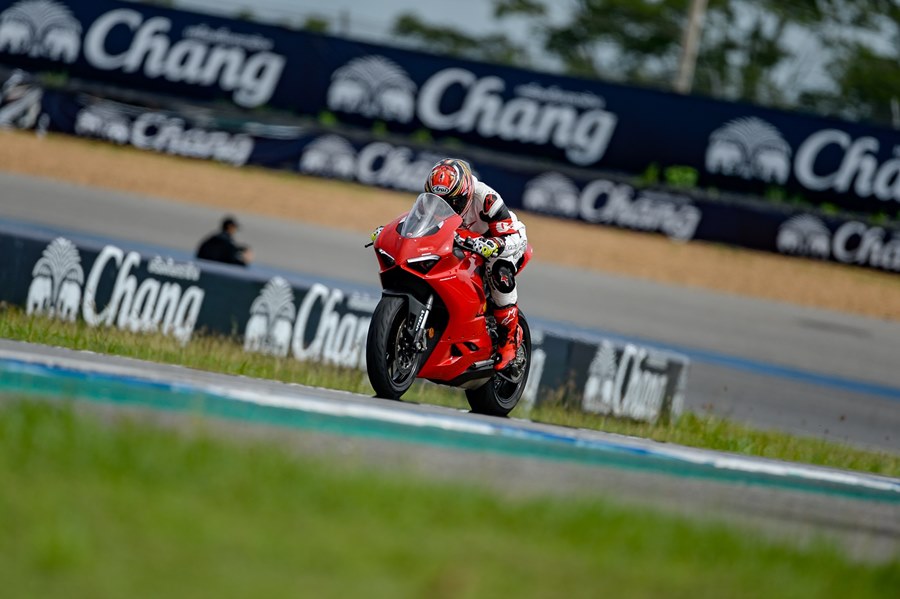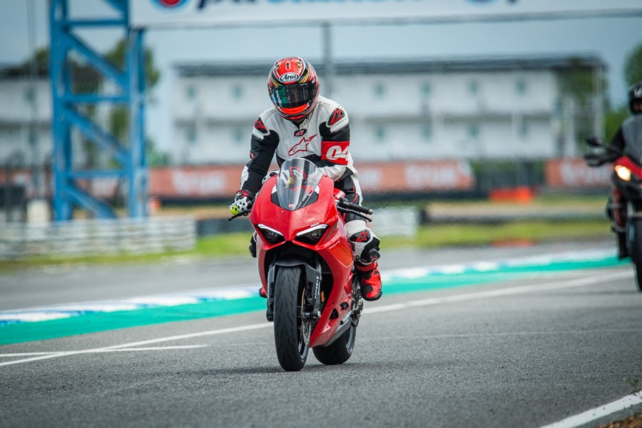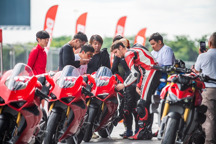ในส่วนของสื่อมวลชนที่ร่วมทดสอบบิ๊กไบค์ 3 รุ่นในครั้งนี้ได้จัดแบ่งลงขี่ตามกลุ่มไปพร้อมกับกลุ่มลูกค้าที่ใช้บิ๊กไบค์ดูคาติ ซึ่งแบ่งออกเป็น 3 กลุ่มตามสีคือ ขาว, เขียว และแดง แยกตามประสบการณ์การขี่ สีขาว ไม่มีประสบการณ์ขี่ในสนามแข่งมาก่อน สามารถใส่ชุดขี่แบบสองท่อนหรือทัวร์ริ่งได้, สีเขียว เคยขี่ในสนามแข่งมาบ้าง และสีแดงมีประสบการณ์และคุ้นชินกับสนามแข่งเป็นอย่างดี ทั้งหมดเพื่อความปลอดภัยของลูกค้าเองด้วย ส่วนผู้เขียนตัวแทนจาก มอเตอร์ไบค์กูรู/เช็คราคา.คอม ได้อยู่ในกลุ่มสีขาว โดยเริ่มเซสชั่นแรกกับรุ่น Panigale V2 พลัง 155 แรงม้า นับเป็นการเริ่มต้นการขี่แทร็คเดย์ที่ดี รายละเอียดตัวรถที่น่าสนใจเริ่มจาก เครื่องยนต์ Superquadro Twin-cylinder และอุปกรณ์อิเล็กทรอนิกส์ IMU 6 แกน ช่วยให้การควบคุมรถในทิศทางต่างๆ มีประสิทธิภาพมากยิ่งขึ้น การปรับเซ็ตช่วงล่างใหม่ เบาะนั่งสะดวกสบายสำหรับขี่มากขึ้น สมรรถนะการขี่แบบสปอร์ตใช้ได้ดีทั้งถนนและในสนาม เคลมว่าเป็นบิ๊กไบค์ที่ขี่ง่ายและสนุก ผู้เขียนมีเวลา 25 นาที ในเซสชั่นแรก แต่แทร็คที่เปียกชื้นจากพายุฝนที่กระหน่ำในช่วงเช้ามืด และบางจุดในสนามยังมีน้ำขังตามขอบแทร็คบ้าง ทำให้ต้องชะลอการการเริ่มต้นทดสอบขี่ออกไปพอสมควร จนทางเจ้าหน้าที่สนามฯ และทีมผู้ฝึกสอนตรวจสภาพสนามแล้วว่าขี่ได้ การทดสอบจึงเริ่มต้น ช่วงรอบแรกผู้เขียนยังขี่เพื่อจับอาการและวอร์มอุณหภูมิยางให้พอรองรับกับความเร็วที่ต้องใช้จริงก่อน แม้มั่นใจกับยางพีเรลลี่ Pirelli Diablo Rosso Corsa II อยู่แล้ว โหมดที่ใช้ในการขี่ถูกปรับไว้ที่ Sport รอบกวาดได้ไวมาก จนต้องพยายามลากแล้วเปลี่ยนราว 9,000 รอบต่อนาที ด้วยน้ำหนักตัว 176 กก. เมื่ออยู่ในสนามกับกำลังขนาด 155 แรงม้า ตอบสนองได้อย่างสนุก ขี่ง่าย ไปได้เร็วตามใจต้องการ ควบคุมได้มั่นคงอย่างที่เคลมไว้ ส่วนตัวมองว่า Panigale V2 (799,000 บาท) เป็นสปอร์ตบิ๊กไบค์ที่เน้นขี่แบบสตรีทสนุกและยังมันไปกับแทร็คเดย์ได้ด้วย ในราคาที่ง่ายสุดกับการเริ่มต้นกับการเป็นเจ้าของดูคาติสักคัน
