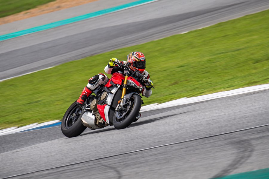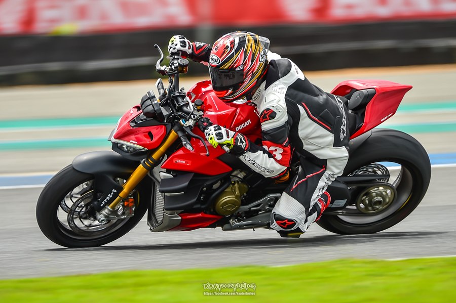 หลังจากพักสลับหมุนเวียนขี่ตามกลุ่มสีและพักกลางวันในช่วงบ่ายเซสชั่นสองผู้เขียนก็ได้คิวเป็น Streetfighter V4S (1,059,000 บาท) บิ๊กไบค์ตัวแรงพลัง 208 แรงม้า รูปทรงสไตล์ Naked แต่เท่ด้วยวิงก์เลท และรูปลักษณ์อันโดดเด่นน่าเกรงขาม เสมือนเป็นการนำ Panigale V4 มาถอดแฟริ่ง น้ำหนักตัวพร้อมขี่อยู่ 199 กิโลกรัม(เวอร์ชั่น S) ขับเคลื่อนด้วยเครื่องยนต์ Desmosedici Stradale 1,103 ซีซี พร้อมเทคโนโลยีอันล้ำสมัย ยางที่ใช้เป็นพีเรลลี่รุ่น Pirelli Diablo Rosso Corsa II ขนาดหน้า 120/70 ZR17 หลัง 200/60 ZR 17 ไม่เหมือนกับใน Panigale V4 ที่ใช้ Supercorsa SP ซึ่งจริงๆ คาแรคเตอร์การทำงานของยางแทบไม่ต่างกัน แต่ Corsa II ทำงานที่อุณหภูมิต่ำกว่าเพื่อการขี่บนถนนส่วนหนึ่ง ในส่วนของการทดสอบขี่ ด้วยท่านั่งที่สบายแบบ Upright ทำให้รู้สึกผ่อนคลายตั้งแต่แรก แม้เบาะสูง 845 มม. CG อาจไม่ได้ต่ำมาก แต่ทำให้พลิกเข้าโค้งง่ายและสนุก ทันทีที่ไหลรถพ้นจากเขตสปีดลิมิต พร้อมเปิดคันเร่งแรงบิดขนาด 123 นิวตันเมตร ที่ 11,500 รอบต่อนาที ก็พารถทะยานพุ่งไปข้างหน้าอย่างรวดเร็ว แรงลมที่ปะทะตัวเข้ามาทำให้สัมผัสได้ถึงขุมพลังอันเร้าใจ ความรู้สึกทุกอย่างต่างไปจาก Panigale V2 ก่อนหน้าแบบสิ้นเชิง ทั้งท่านั่ง ความรู้สึกตอบกลับ ความสนุกที่แตกต่าง ด้วยแฮนด์บาร์ที่กว้าง การไหลเข้าโค้งทำได้อย่างยอดเยี่ยม อัตราเร่งและระบบช่วยเหลือตอนออกจากโค้งที่ปรับไว้ในโหมด Race ทำงานผสานกันได้อย่างดี ให้ความมั่นใจมากขึ้นในทุกรอบการขี่ ส่วนเกียร์ควิกชิฟท์ต่อกันได้เนียนแทบไม่รู้สึก ในช่วงทางตรงรถให้ความมั่นคง ความเร็วทะลุ 220 กม./ชม. ไปแบบสบายๆ และไปได้อีกเยอะ แต่ผู้เขียนขี่ไปตามประสบการณ์ในกลุ่มสีขาว ก็นับว่าเร่งได้เร็วประทับใจมากพอแล้ว การชะลอเบาเบรกก่อนเข้าโค้งให้การหน่วงที่สมูธและมีพลังจนมั่นใจตั้งแต่ครั้งแรก
