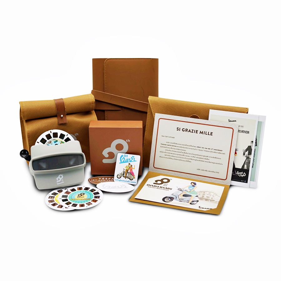 สกู๊ตเตอร์พรีเมี่ยมรุ่นลิมิเต็ด "Vespa SPRINT 150 i-Get ABS 10TH ANNIVERSARY THAILAND LIMITED EDITION" สีเงิน Grigio Seta มีวางจำหน่ายเพียง 1,010 คัน เท่านั้น มาพร้อมชุดของพรีเมี่ยม "Time Capsule Bag" พร้อมบอกเล่าเรื่องราวจากอดีต บันทึกเหตุการณ์ปัจจุบันที่พร้อมส่งต่อไปยังอนาคตผ่านของพรีเมี่ยม 3 ชุด 3 เรื่องราว ประกอบด้วย