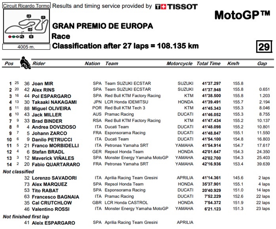 จากนั้นก็กลายเป็น Mir ที่นำหน้าเพื่อนร่วมทีมโดยมี Pol Espargaro ตามมา จนในที่สุด Mir ก็สามารถขึ้นมาเป็นผู้นำในรอบที่ 16 แต่ Pol Espargaro ก็ไม่ยอมให้ Suzuki ทั้งสองทิ้งห่างมากนักแล้วก็เป็น Tito Rabat ทีม Esponsorama Racing ที่เข้าพิทและออกจากการแข่งขันไป ท้ายที่สุดก็เป็น Mir ที่เข้าเส้นชัย คว้าชัยชนะไปครองได้นับเป็นผู้ชนะคนที่ 9 ของปีนี้ โดยมี Rins และ Pol Espargaro ตามมา ตอนนี้ Mir จ่อจะคว้าแชมป์ MotoGP ครั้งแรกในประวัติศาสตร์ ส่วน Rins ก็มีคะแนนสะสมเท่ากันกับ Quartararo ส่วนสนามต่อไปยังจัดขึ้นที่ Circuit Ricardo Tormo ในรายการ Gran Premio de la Comunitant Valenciana ซึ่งเป็นสนามรองสุดท้ายของปีนี้