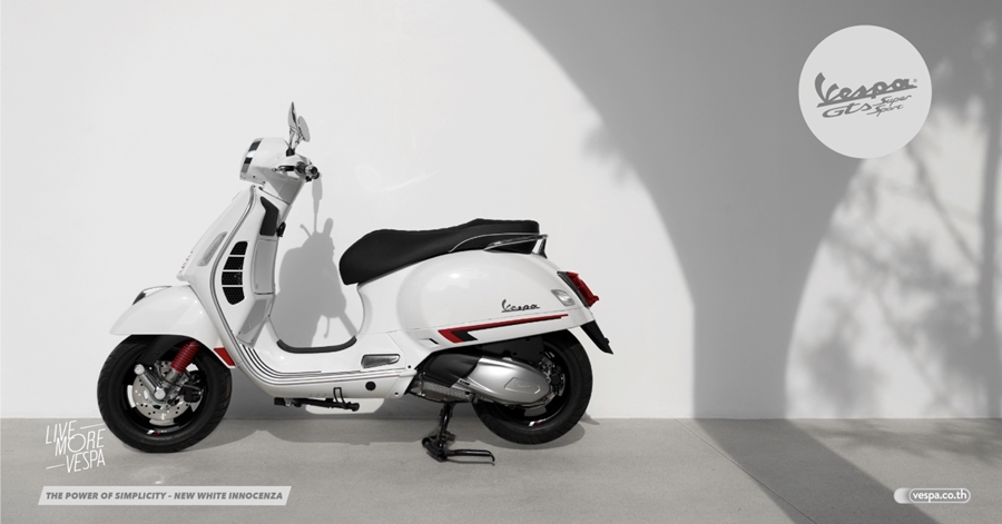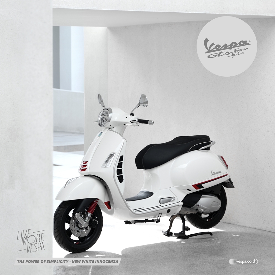 VESPA GTS SUPER SPORT 300 HPE สีขาว (WHITE INNOCENZA) ตอบโจทย์ไลฟ์สไตล์ของ ผู้ที่มองหาความสปอร์ตเหนือระดับที่ไม่เหมือนใคร พร้อมให้คุณออกเดินทางเพื่อไปค้นหาประสบการณ์ใหม่ๆ โดยสนนราคา 215,900 บาท