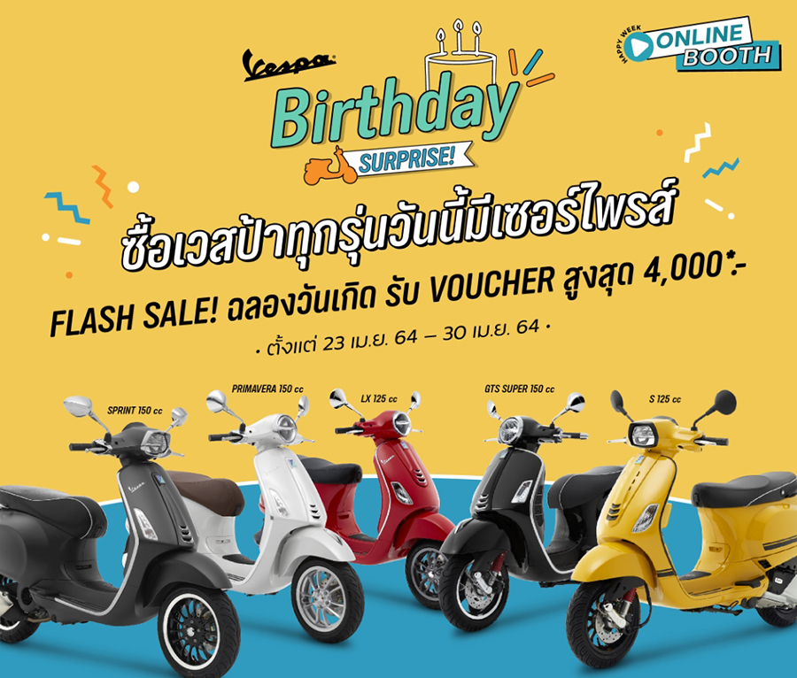 พบกับ VESPA BIRTHDAY SURPRISE ! ที่ยกขบวนส่วนลด พร้อมของแถมสุดพรีเมี่ยมให้ลูกค้าใหม่ และลูกค้าปัจจุบัน กับโปรโมชั่น FLASH SALE ตลอด 7 วัน ตั้งแต่วันที่ 23 - 30 เมษายน 64