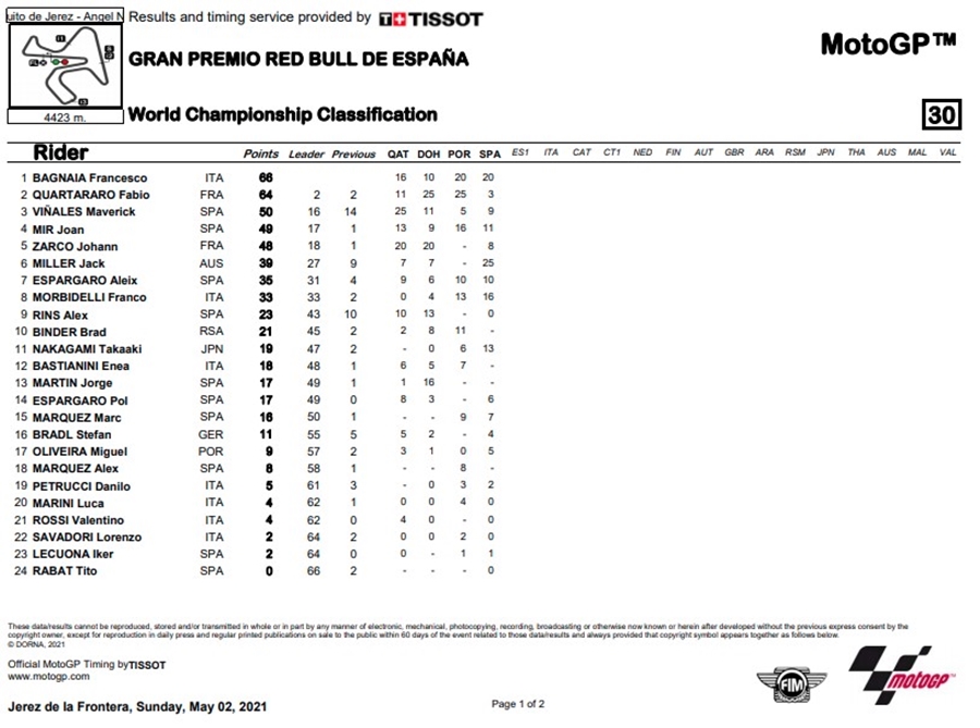 ท้ายที่สุด Miller นำห่างเกิน 1 วิเข้าเส้นชัยคว้าชัยใน Jerez ส่วน Bagnaia เข้าวินเป็นอันดับ 2 ทำให้คะแนนสะสมนำเป็นที่ 1 ด้านอันดับที่ 3 เป็นของ Morbidelli ทางด้าน Quartararo นั้นจบการแข่งขันในอันดับที่ 13 โดยโดน Miguel Oliveira จาก Red Bull KTM Factory Racing และ Stefan Bradl จาก Honda HEC แซงไปนั่นเอง นับเป็นครั้งแรกตั้งแต่การแข่งขัน Dutch TT ปี 2016 ที่ Miller ได้รับธงตาหมากรุกของการแข่งขัน MotoGP และเป็นครั้งแรกของ Ducati ใน Jerez