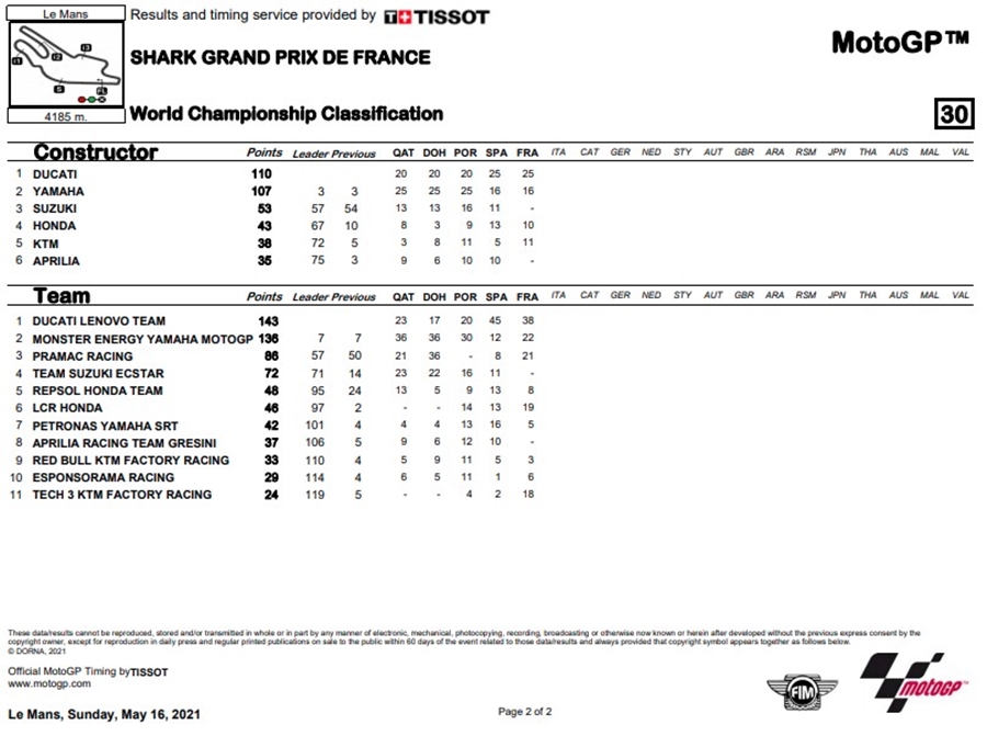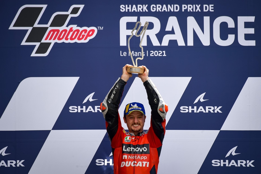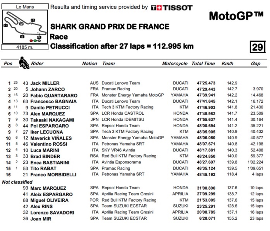 Jack Miller จาก Ducati Lenovo Team เอาชนะ French GP ถึงแม้จะโดนโทษ Long Lap Penalty ถึง 2 รอบจากการใช้ความเร็วเกินลิมิตในพิท แต่ก็สามารถคว้าชัยเหนือ 2 นักบิดเจ้าบ้านอย่าง Johann Zarco จาก Pramac Racing และ Fabio Quartararo จาก Monster Energy Yamaha MotoGP ที่ลงสนามครั้งนี้ด้วยความหวังว่าจะเป็นนักบิดชาวฝรั่งเศสที่จะคว้าชัย แต่กลับกลายเป็นนักบิดจากออสเตรเลียไปซะได้