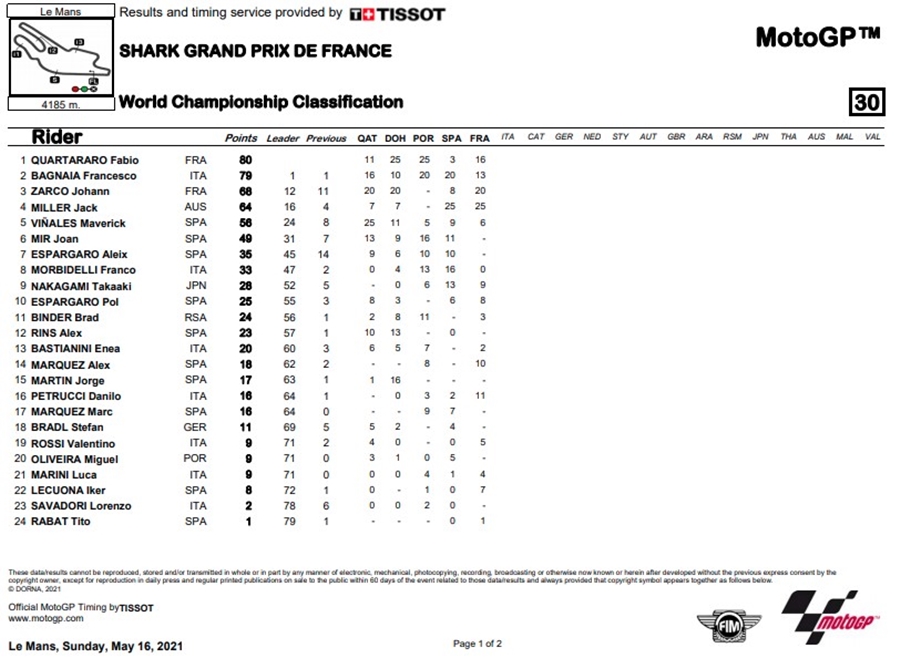 ในสนามนี้ยังมี Aleix Espargaro และ Lorenzo Savadori จาก Aprilia Racing Team Gresini, Miguel Oliveira จาก Red Bull KTM Factory Racing ที่ต้องออกจากการแข่งขัน ด้านคะแนนสะสม Quartararo แซงขึ้นมาเป็นผู้นำด้วยคะแนน 80 แต้ม แซง Bagnaia ไป 1 แต้ม ตามมาด้วย Zarco ที่มีคะแนน 68 แต้ม ติดตามสนามถัดไปในรายการ Gran Premio d'Italia Oakley ที่สนาม Autodromo Internazionale del Mugello