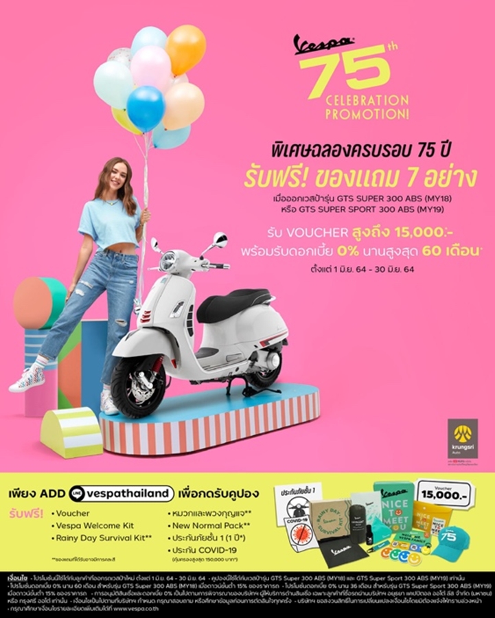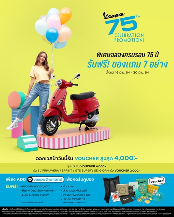 พร้อมเตรียมมอบอีกหนึ่งความพิเศษเพื่อแฟนๆ เวสป้า ขนขบวนโปรโมชั่นพิเศษฉลองครบรอบ 75 ปี มอบความพิเศษสุดเอ็กซ์คลูซีฟด้วยของสมมนาคุณและพรีเมี่ยมมากมาย