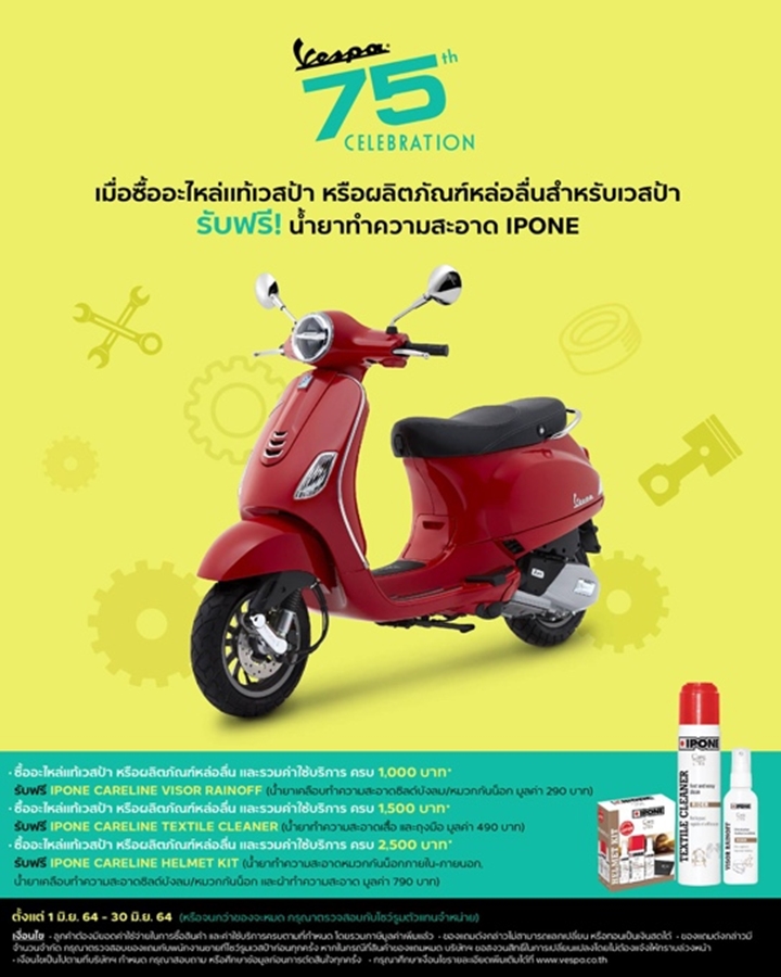 • ซื้ออะไหล่แท้เวสป้า หรือน้ำมันหล่อลื่น รวมค่าใช้บริการ ครบ 1,500 บาท* รับฟรี! IPONE CARELINE TEXTILE CLEANER น้ำยาทำความสะอาดเสื้อ และถุงมือ (มูลค่า 490 บาท)