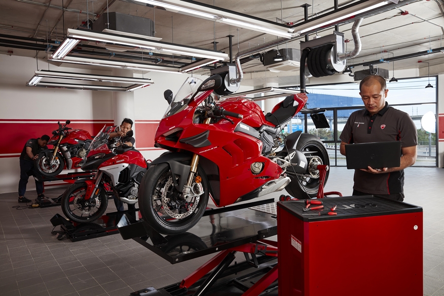 ศูนย์บริการตกแต่งด้วยดีไซน์ทันสมัย ติดตั้งเครื่องมืออุปกรณ์ครบครันเพียบพร้อมไปด้วยเทคโนโลยี ช่างเทคนิคได้รับการอบรมเพื่อให้ตรวจวิเคราะห์ได้อย่างแม่นยำ ด้วยโปรแกรมในการตรวจสอบ Ducati Diagnosis System 3.0 (DDS 3.0) ตรวจสอบระบบการทำงานอิเล็กทรอนิกส์ของตัวรถ และอัพเกรดซอฟท์แวร์สำหรับใช้ขับขี่ในสนามและสามารถซ่อมบำรุงให้เป็นไปตามมาตรฐานของแบรนด์ Ducati และนับเป็นครั้งแรกในประเทศไทย โชว์รูมแห่งนี้ติดตั้ง Moto GP license simulator เครื่องจำลองการขับขี่ เพื่อประสบการณ์พิเศษให้นักบิดและแฟนดูคาติได้ทดลองขี่ดูคาติในบรรยากาศจำลองจากสนามแข่ง Moto GP ที่สวยงามที่สุดในโลก