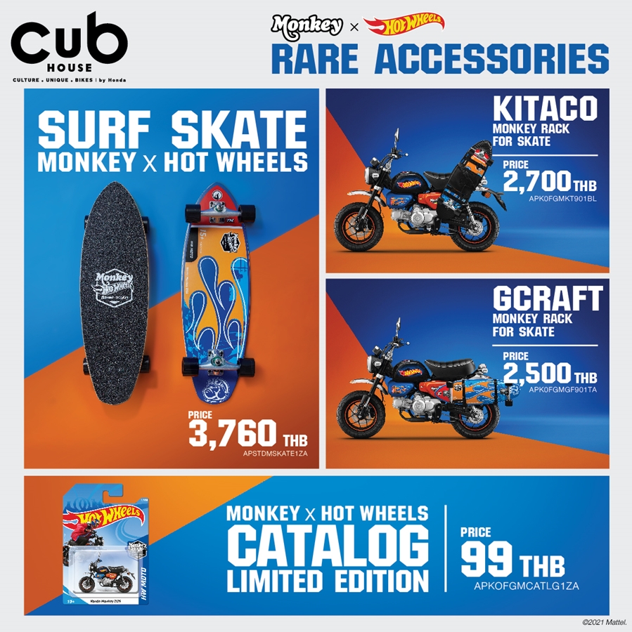 วางจำหน่ายด้วยราคาแนะนำ 139,900 บาท ต่อเซ็ต ที่ร้าน CUB House ทุกสาขา เริ่มตั้งแต่วันที่ 17 สิงหาคม 2021 เป็นต้นไป Accessories มีจำหน่ายเฉพาะที่ CUB House by Honda เท่านั้น ไฮไลท์อยู่ที่ เซิร์ฟสเก็ต Monkey Hot Wheels Special Limited กราฟิกลายไฟสไตล์อเมริกาสุดเฟี้ยวฟ้าว มีจำหน่ายแยก จำกัดเพียง 1,000 ชิ้น เท่านั้น และชุดแต่งแร็ควางสเก็ตจากแบรนด์สำนักแต่งชั้นนำอย่าง KITACO และ GCRAFT ซึ่งสามารถติดตั้งกับรถได้หลากหลายรุ่น พร้อมทั้งมี Catalog ดีไซน์พิเศษ ที่จำลองจากแพ็กเกจ Hot Wheels ให้เก็บสะสมกันอีกด้วยกลายเป็น Rare Item ที่นักสะสมจะพลาดไม่ได้เด็ดขาด